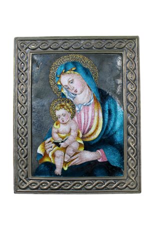 PLACCA in metallo smaltato raffigurante madonna con bambino con cornice in argentato 800 maestranze Est Europa Primi 900 h cm 30,5 x 24,5
