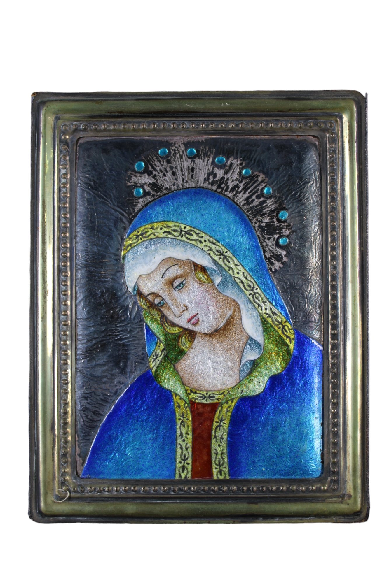 PLACCA in metallo smaltato raffigurante madonna dentro cornice in metallo sbalzato h cm 22,5 x 17,5