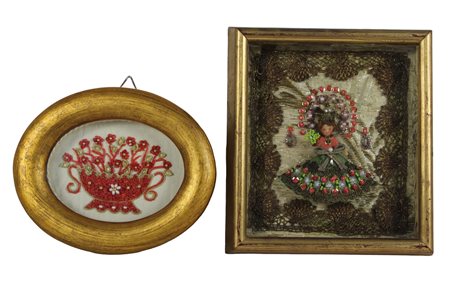 LOTTO COMPOSTO DA una composizione raffigurante bambina con abiti tradizionali e una composizione di micro coralli e perline raffigurante vaso con fiori h cm 18 x 16 / h cm 13,5 x 16