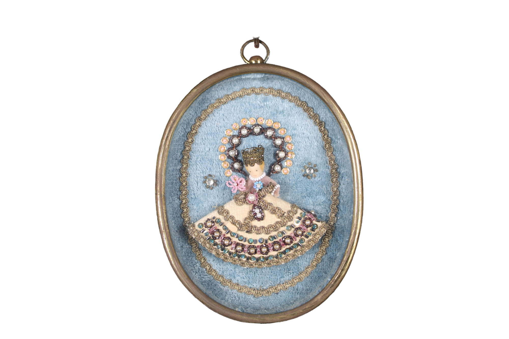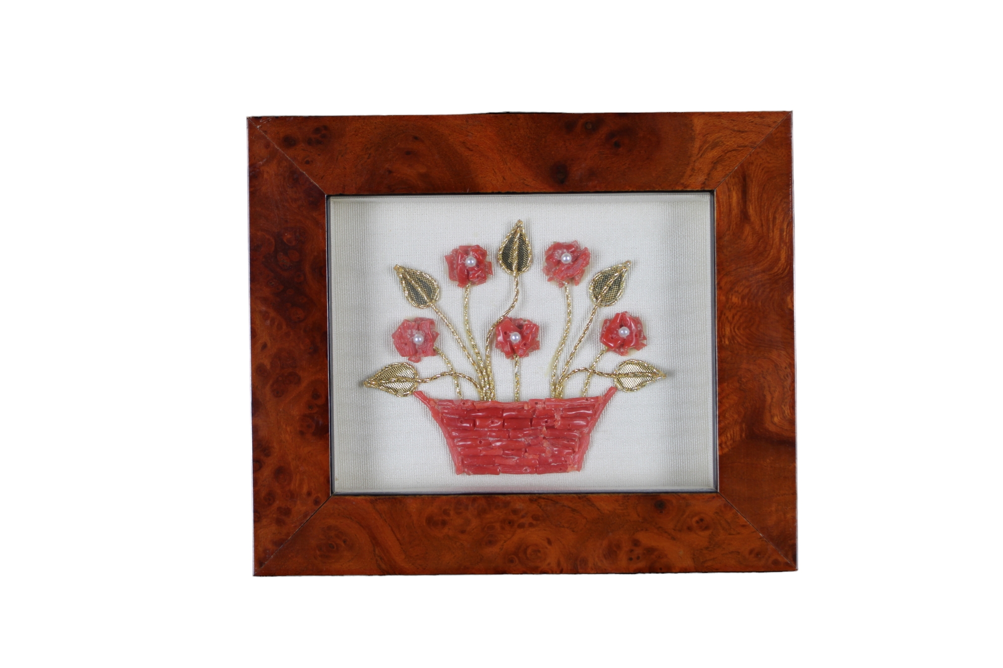 LOTTO COMPOSTO DA una composizione raffigurante bambina con abiti tradizionali e una composizione di micro coralli e perline raffigurante vaso con fiori h cm 16 x 13 / h cm 11 x 13