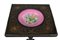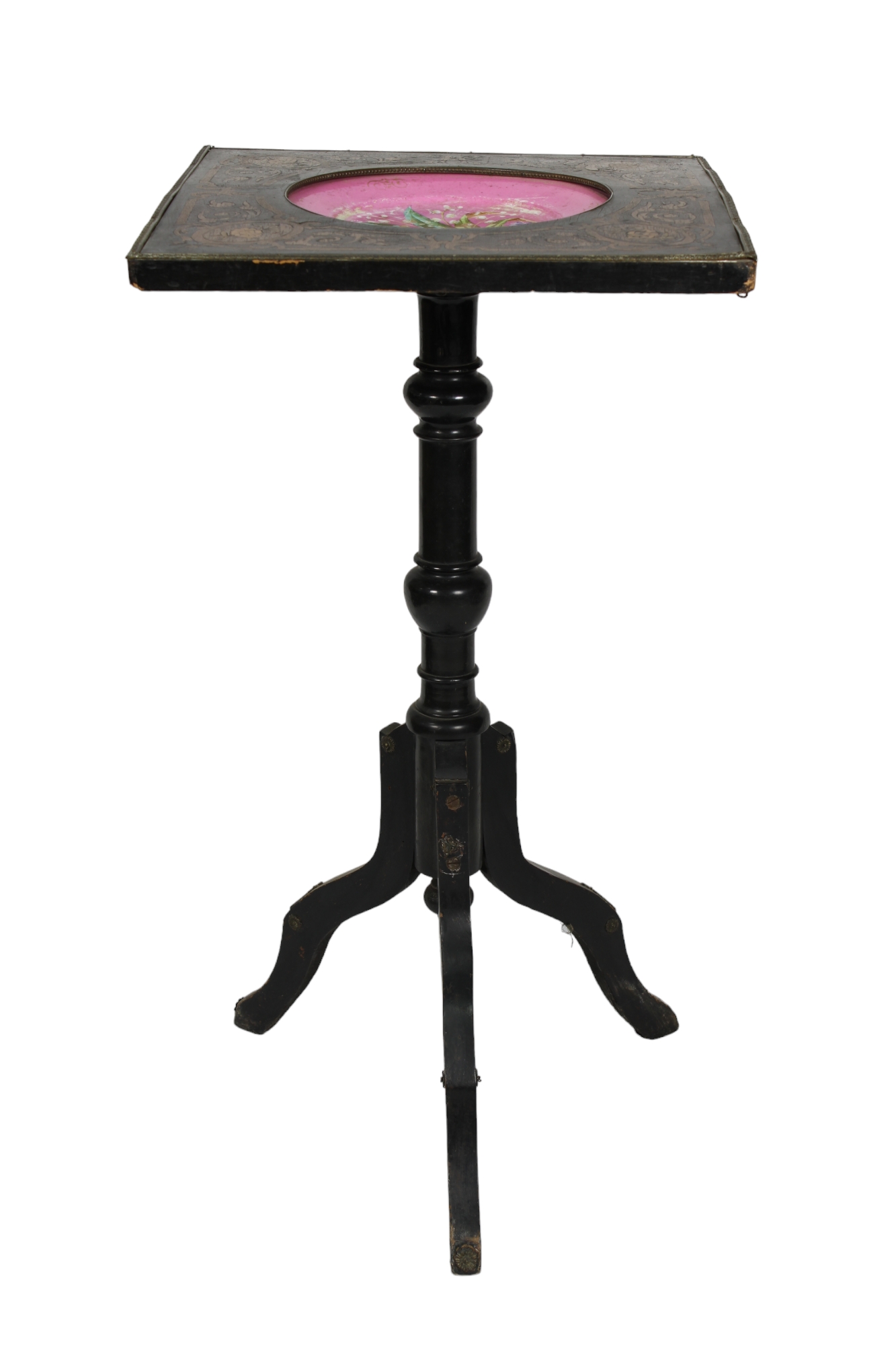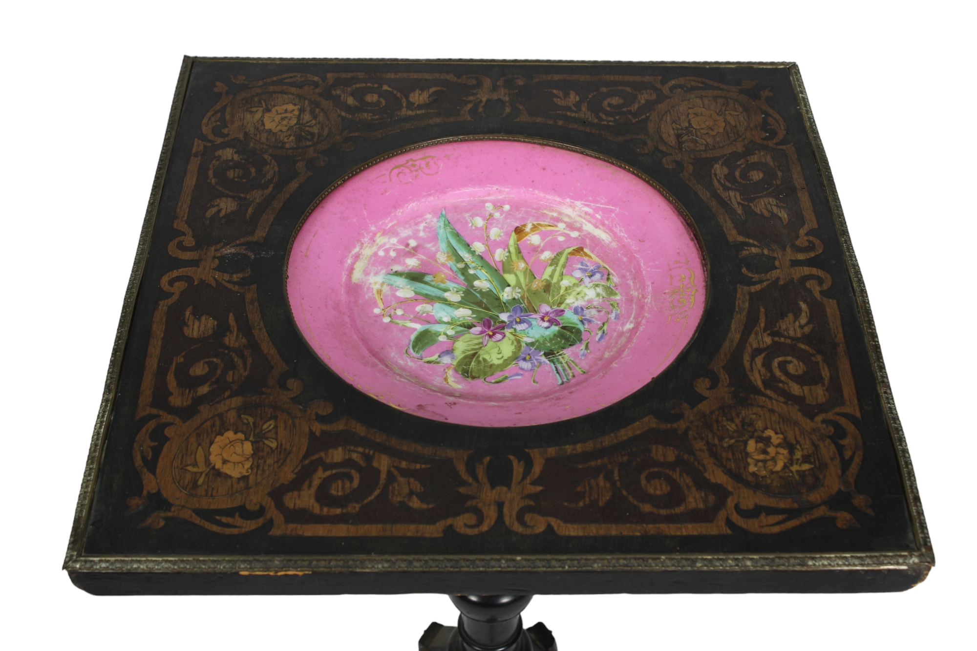 TAVOLINO NAPOLEONE III in legno ebanizzato con intarsi in varie essenze di legno piano arricchito da centro in porcellana dipinta a motivi floreali e applicazioni in bronzo Francia XIX secolo h cm 77 x 40 x 40
