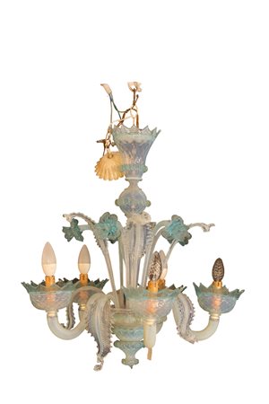 LAMPADARIO A 5 BRACCI in vetro di Murano colorato nel tono dell'azzurro manifattura Murano Venezia Primi 900 h cm 70 x 50