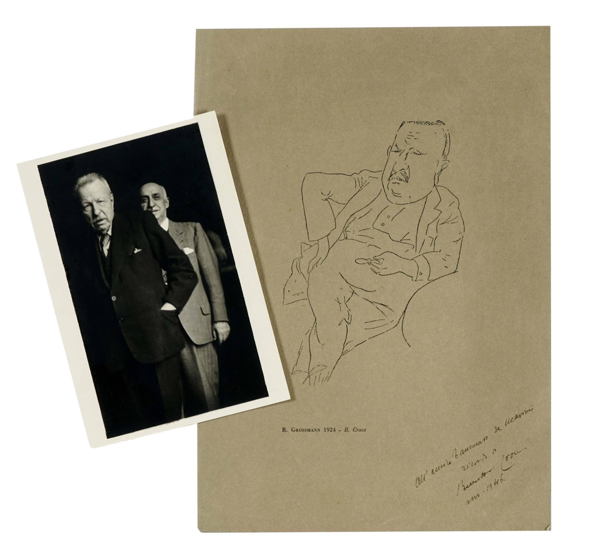 Correzioni autografe a inchiostro nero. Dimensioni varie. (7)La raccolta comprende: 1 dattiloscritto con correzioni autografe di Per la storia del comunismo in quanto realtà politica; 1 testo a stampa con correzioni autografe di Per la storia del comunismo in quanto realtà politica; 1 testo a stampa con correzioni autografe di Uno sconosciuto umanista quattrocentesco. Giovanni Brancati e il racconto di una sua tragedia d'amore. Nel lotto anche una fotografia di Benedetto Croce con Tammaro De Marinis, alcune carte a stampa relative ad un concorso a borse di studio (una borsa di studio dedicata a De Marinis), 2 incisioni che raffigurano Croce (1 con dedica di Croce a De Marinis).