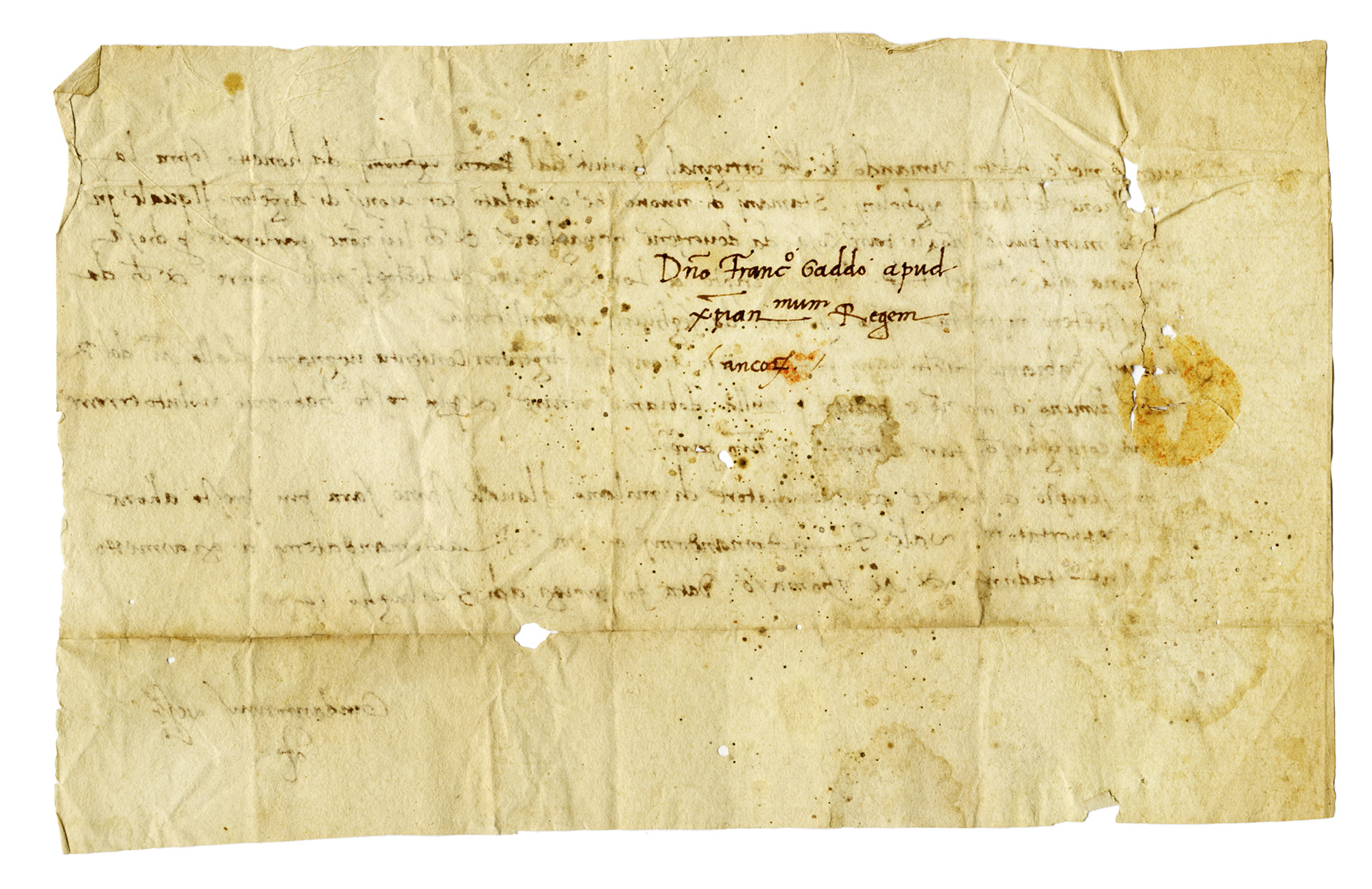 Manoscritto a inchiostro bruno. 1 carta scritta al recto (scritte 12 righe in totale). Al verso: Domino Francisco Gaddo apud Cristianissinum Regem Francorum. Testo in italiano e latino. Piccole mancanze di carta con perdita di testo. Tracce di sigillo. Dimensioni: 134x212 mm. (1)Guidantonio Vespucci (1436-1501) figlio di Giovanni, fu giureconsulto famoso e uomo di ingegno e destrezza singolare, come scrisse Guicciardini. Fidatissimo di Lorenzo il Magnifico, divenne suo ambasciatore a Roma presso Papa Sisto IV e a Parigi presso Luigi XI.