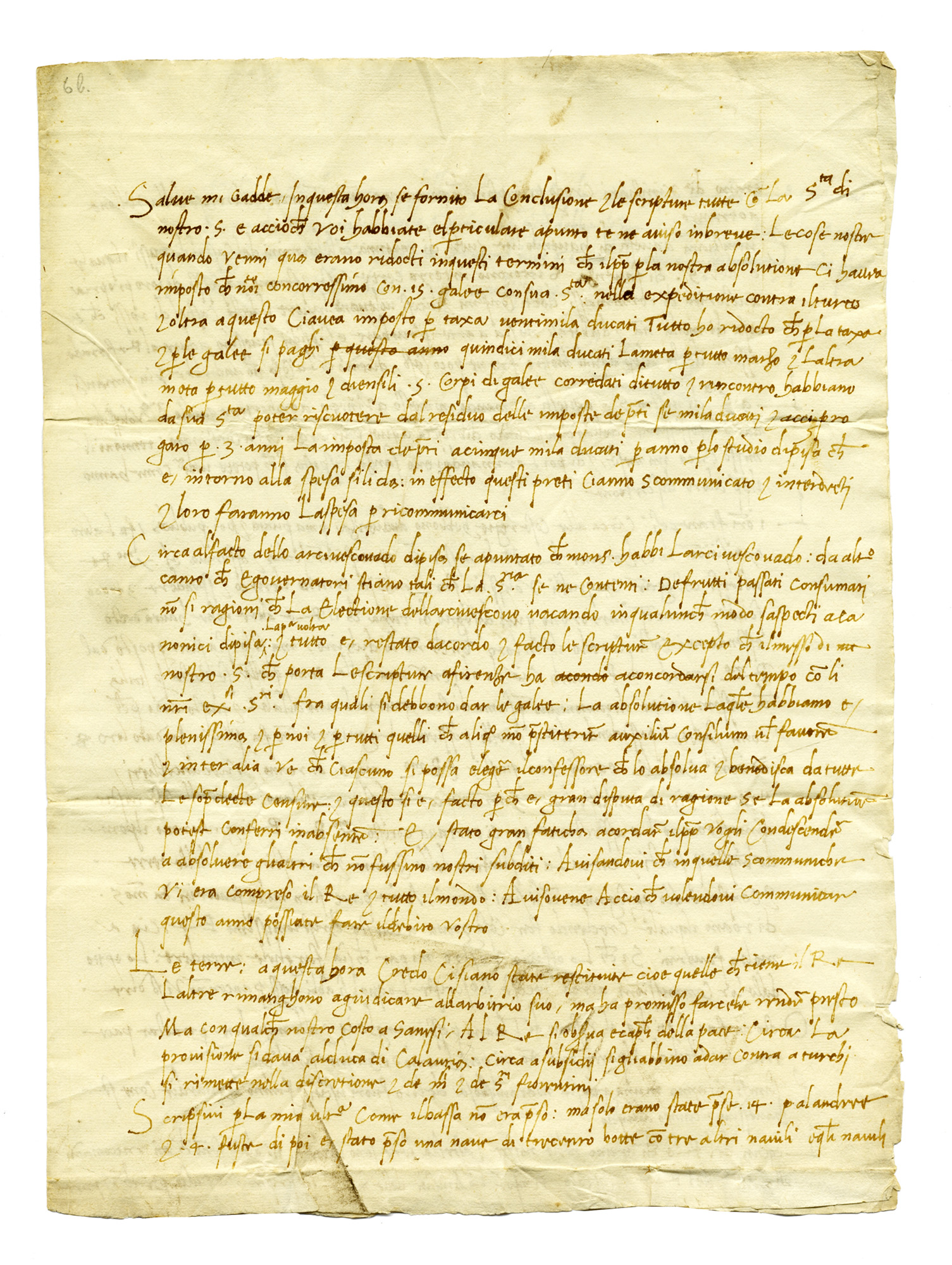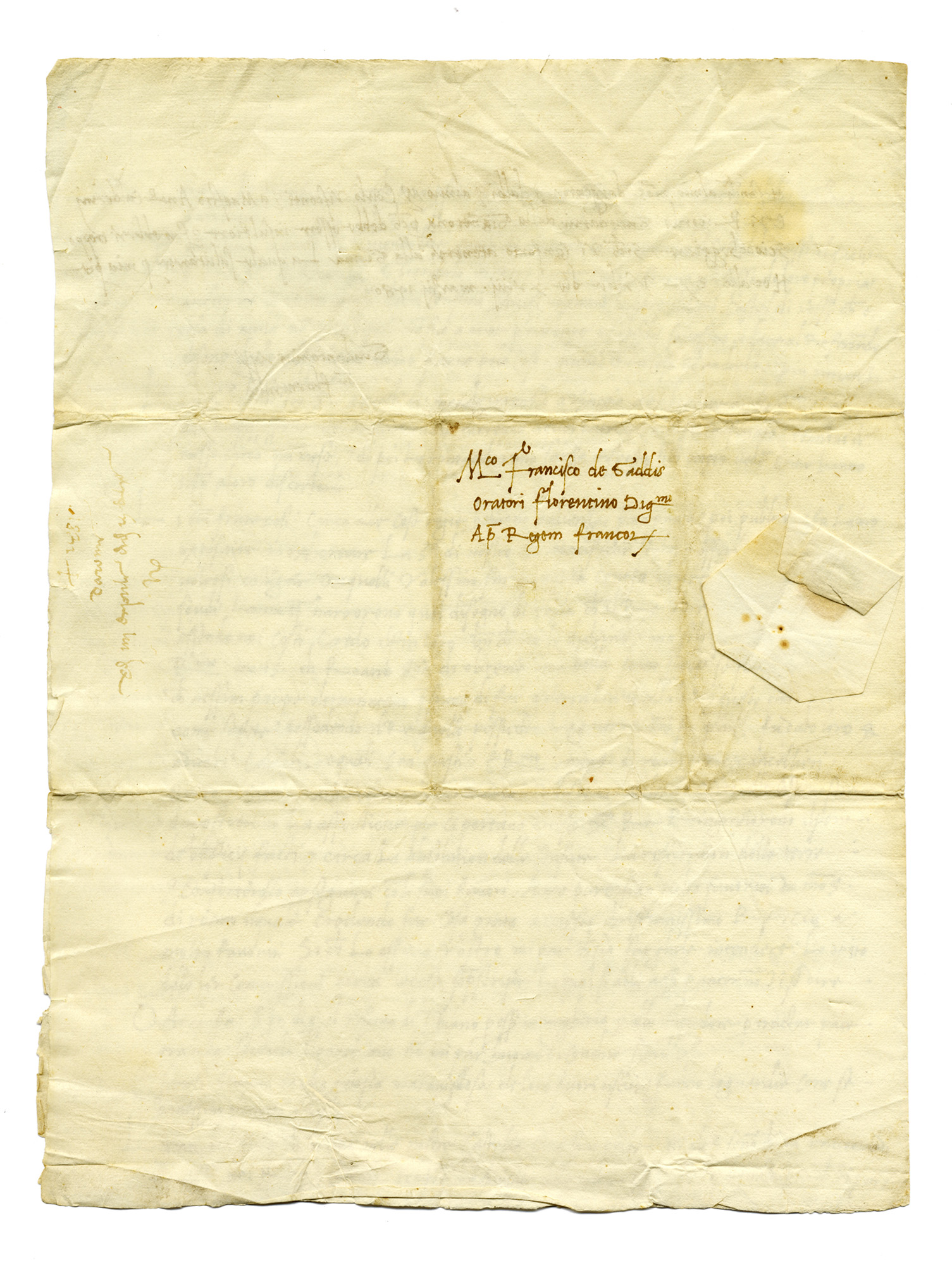 Manoscritto a inchiostro bruno. 1 bifolio, scritte 3 pagine (scritte 70 righe in totale). Testo italiano e latino. Al verso della seconda carta il nome del destinatario: Magnifico Francisco de Gaddis oratori fiorentino Dignissimo Apud Regem Francorum. Sigillo in carta conservato. Dimensioni: 300x220 mm. (1)Guidantonio di Giovanni Vespucci (1436-1501) fu giureconsulto famoso e uomo di ingegno e destrezza singolare, come scrisse Guicciardini. Fidatissimo di Lorenzo il Magnifico, fu suo ambasciatore a Roma presso Papa Sisto IV e a Parigi presso Luigi XI. Vespucci scrive a Francesco Gaddi (1441-1504), sovrintendente della Cancelleria dei Dieci di Firenze e uomo di fiducia di Lorenzo, che nel 1478 lo nominò oratore presso il Re di Francia. Argomento di questa lunga e importantissima lettera è il costo della pace tra la Chiesa e Firenze (a seguito della guerra di papa Sisto IV contro la città, provocata dalla reazione dei Medici alla Congiura de' Pazzi), e al contempo la revoca della scomunica per Lorenzo il Magnifico ed i maggiorenti fiorentini. L'astutissimo Vespucci informa Gaddi (presso il re Luigi XI di Francia) di essere riuscito a ridurre di molto le richieste del Papa per la concessione della pace e la cancellazione della scomunica, in termini sia di denaro che di galee da utilizzare contra il Turcho (siamo nel periodo della prima guerra turca). Per soddisfare la richiesta economica di Sisto IV senza gravare sulle casse di Firenze, Vespucci ottiene dal Papa stesso, con mossa magistrale, la possibilità di imporre pesanti imposte ai preti toscani; in proposito scrive beffardo: in effecto questi preti cianno scomunicato et interdecti et loro faranno la spesa per ricommunicarci. Nel seguito della lettera, Vespucci accenna alle complicate situazioni degli arcivescovadi di Pisa e di Brescia, alla restituzione di terre, al duca di Calavria (Calabria: Alfonso II di Aragona, che un anno dopo guiderà le truppe di liberazione di Otranto dagli ottomani), ai veneziani che per soldi aiutavano i turchi: Viniziani [...] che portavano a prezo Turchi et altre cose dalla Vellona [Valona] a Otranto, alle liti tra Venezia e il Signor di Favenza [Faenza] ecc. Vespucci inoltre scrive a Gaddi che la scomunica cancellata dal Papa riguardava anche il Re di Francia [Luigi XI], che aveva parteggiato per Firenze: E stato gran fatiche acordare il Papa vogli condescendere a absolvere gli altri che non fussino nostri subditi. Avisandovi che in quelle scomuniche vi era compreso il Re e tutto il mondo (tout le monde, cioè la corte del Re). Vespucci inoltre conferma quanto già si sapeva circa la mancata cattura del bassa (Gedik Ahmet Pascià, comandante dell'esercito e della flotta di Maometto II) e descrive le navi catturate ai turchi: 14 palandree (palandre: grandi imbarcazioni a vela a fondo piatto), 4 fuste (galee sottili di basso pescaggio) e una nave di trecento botte (nave da circa 190 tonnellate di stazza). L'ultima parte della missiva riguarda l'esortazione degli oratori franzesi al Papa affinché favorisca la pacificazione dell'Italia, legandola alla disponibilità di Luigi XI a partecipare alla costosa guerra contro i turchi: fu la loro expositione in exhoratre la Santità di Nostro Signore a pacificare Italia et offeriva la Christianissimo Re volersi collegare con quelli volessino far lampresa contra il turco et spendere 300000 scudi lanno; in aggiunta a questo, gli oratori francesi chiedono al Papa una sorta di pacificazione francese: di obtenere una bolla come quella se facta per Italia che nessun principe oltramontano presuma di far guerra luno allaltro. Vespucci accenna anche ai: Mons. di Roano [Rouen], ai vicecancellieri di Noara, Siena, Malfecta, San Marco, Ulisbona, Milano, al vescovo di Thiano, al mio Mons. d'Argenton et d'Alba e al mio messer Carlo Visconti et a Maestro Antonio Calderini. Molto argute a pungenti, infine, sono due frasi del Vespucci; la prima è sui senesi: e Sanesi stanno in una gelosia maravigliosa de loro fuori usciti et fanno le guardie come se havessino il campo (militare) alluscio; la seconda è un consiglio a Gaddi, perché eviti di fare sciocchezze con l'amante giovane (insulfiore): vi ricordo guardarvi dalla Gianetona perche debba essere insulfiore et farebbivi scioccheggiare, siche vi conforto a tenervi alla Giana, la quale saluterete per mia parte.