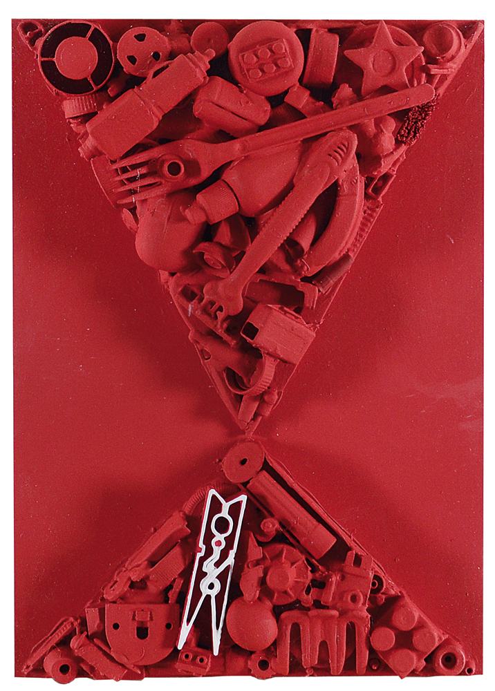 colore acrilico e materiale plastico su tavola cm. 35x25x7, firma e titolo al retro, dichiarazione d'autenticità dell'artista su foto, entro teca in plexiglass.