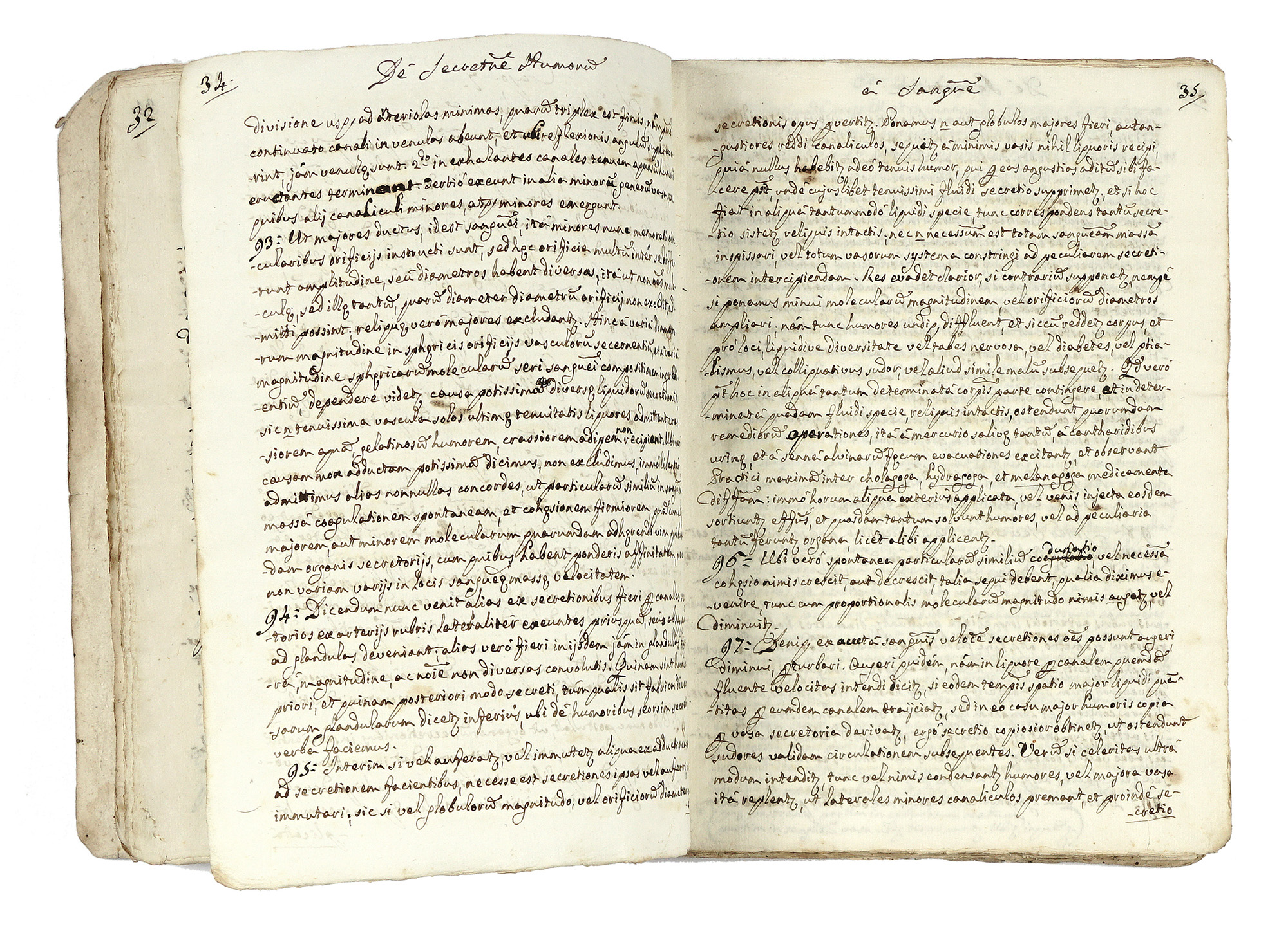 Manoscritto a inchiostro bruno. Pagine 216, [2] di indice, [2], da 217 a 225, cui segue [1] carta bianca. Testo in latino. Brossura coeva con tracce d'uso. Dimensioni mm 160 x 220 mm. (1)Titolo completo dell'opera: Medicae Institutionis Prole/gomena / pseu / Physiologia / Codex Unicus / Ca.M.co Pizzurno – Jo[han]nes Bap[tis]ta Pradines / in Nosocomio Genuensi / Medicina / auditor. L'ampio trattato, suddiviso in capitoli, contiene i seguenti argomenti: de solidis humani corporis; de humoribus; de sanguine; de facultatibus et functionibus; de circulatione sanguinis; de respiratione; de secretione humoribus et sanguine; de secretione et usu lympha; de secretione et usu fluidi nervei; de secretione, natura et usu bilis; de secretione, natura et usu pinguedinis; de exhalatione; de inhalatione; de urina, secretione, excuctione et natura; de secretione, natura, et usu saliva et succorum gastrici, pancreatici, intestinalis; de fame, siti et alimentorum natura, masticatione, deglutitione; de digestione; de natura et motu chyli vasa lactea et de eius ingressu, et mutatione in sanguinem; de nutritione; de motu musculari; de sensibus in genere; de tactu; de gustu; de olphacta; de auditu; de visu; de vigilia et somno; et ultimus de hominis generatione.