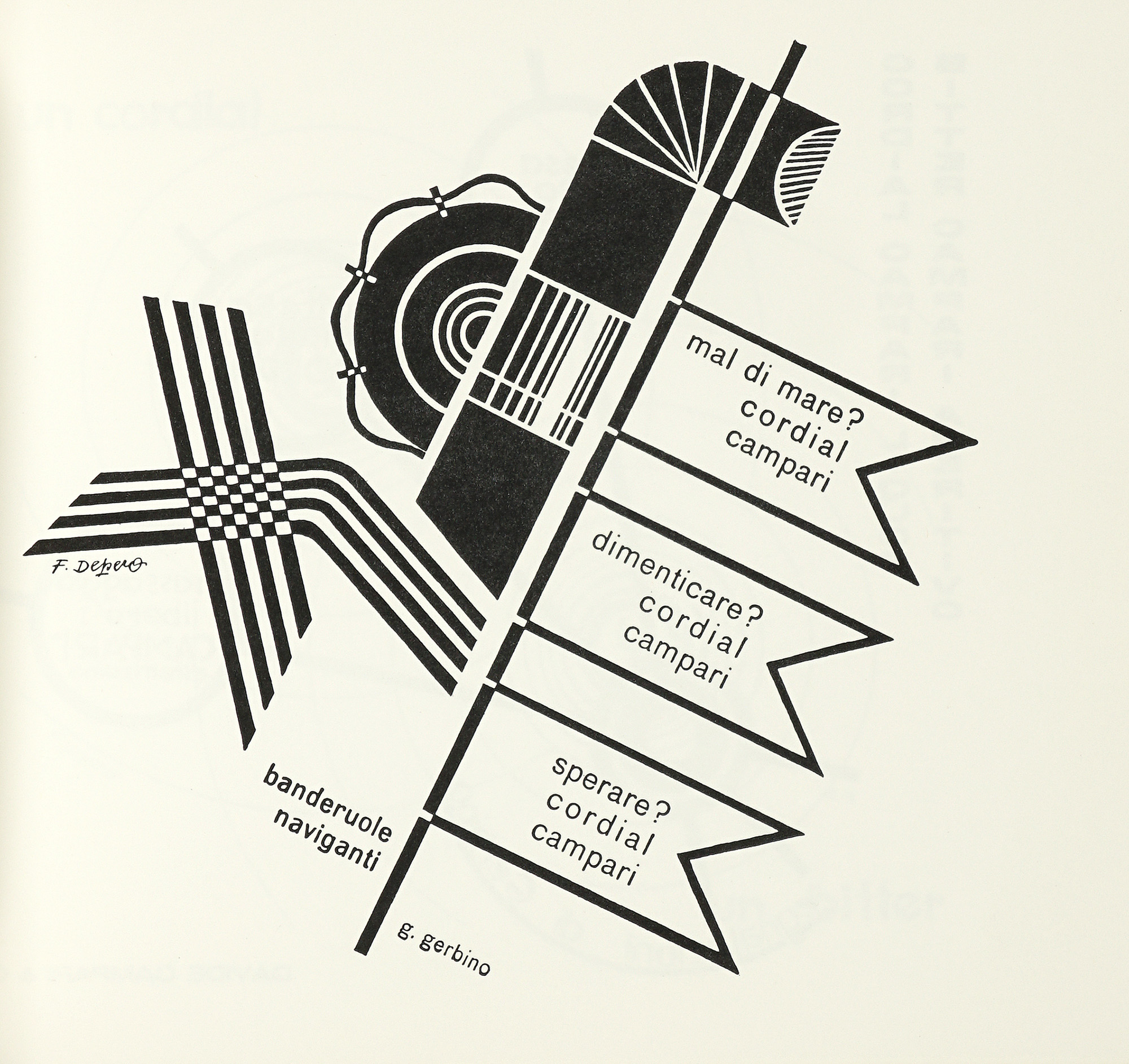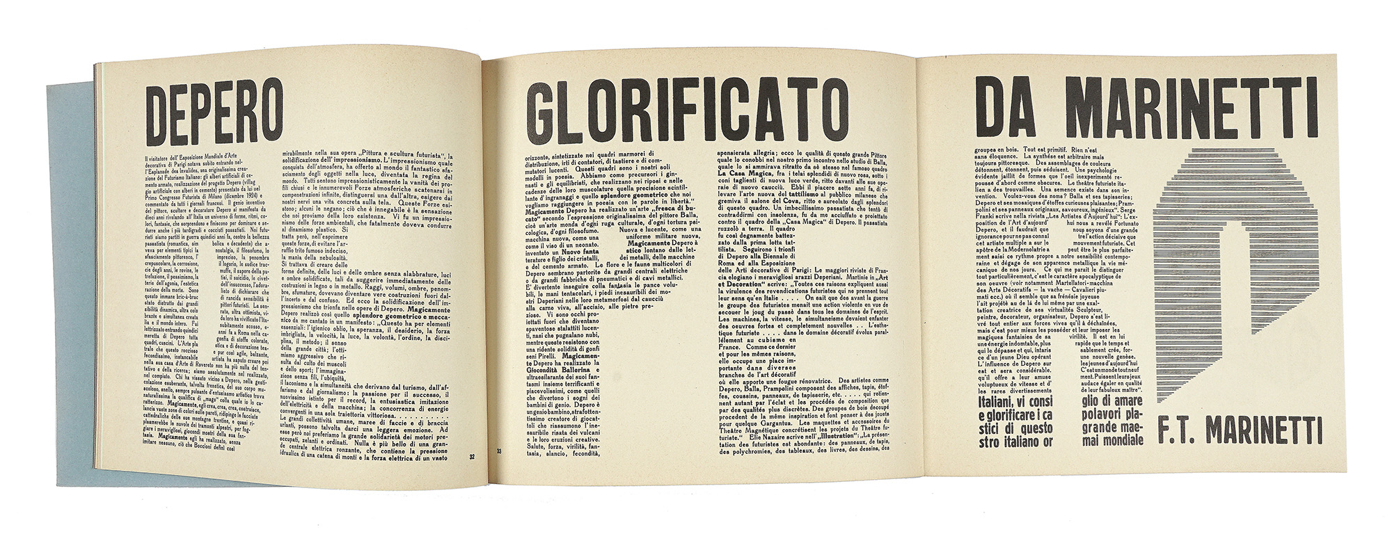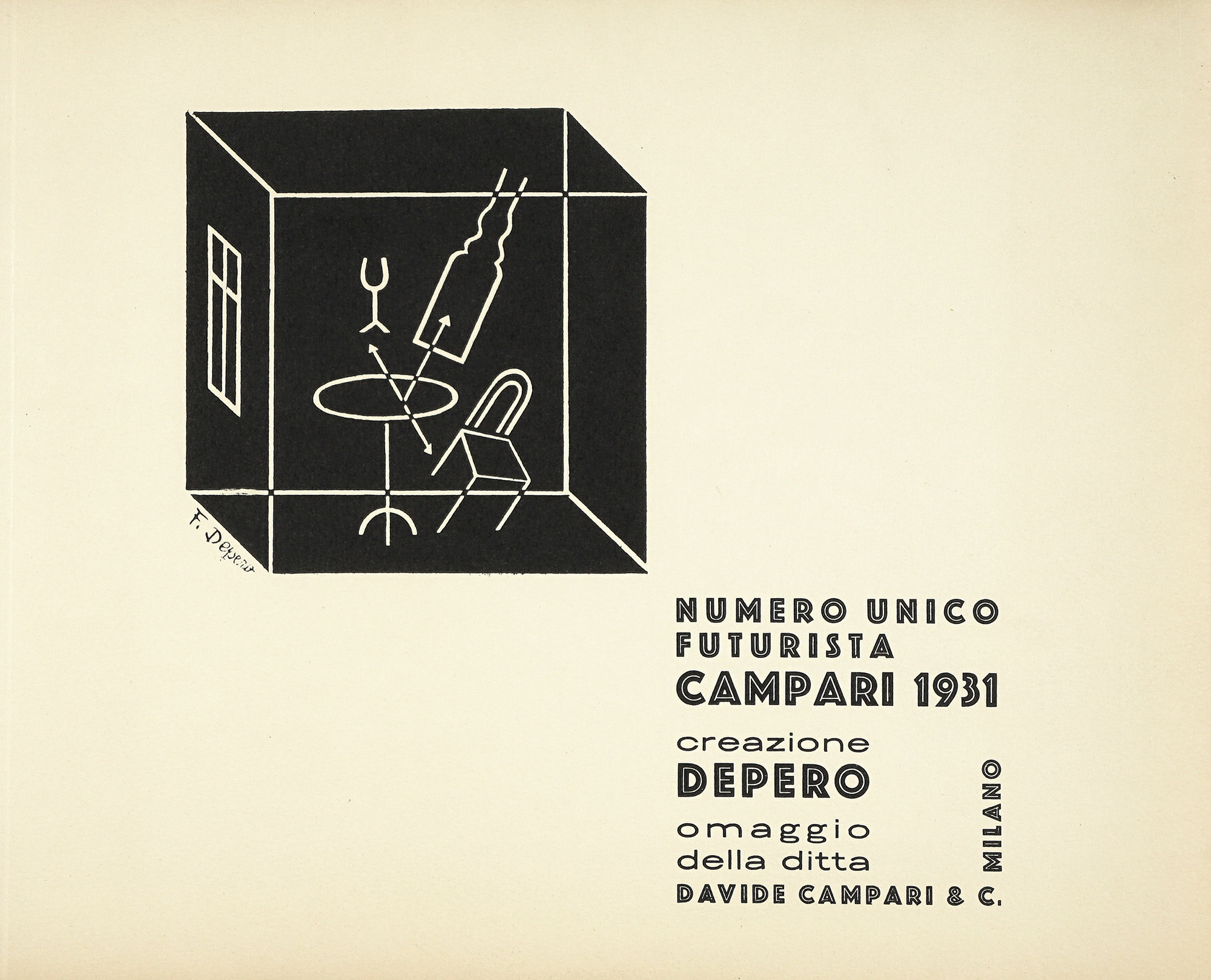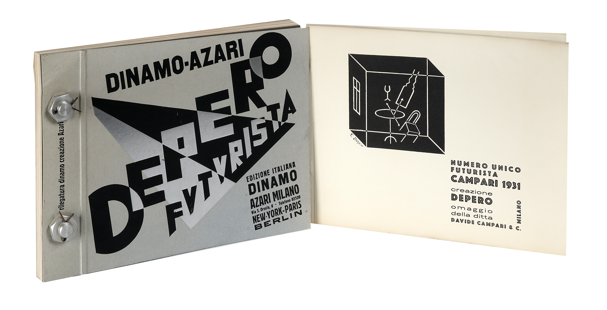 In-4° oblungo (mm 240x320). Legatura bullonata con piatti in carta decorata e titoli impressi in nero e argento ai piatti. Ossidazione da esposizione al piatto anteriore, altrimenti ottima conservazione. Assente il compendio a cura Luciano Caruso e la cartella originale in cartonato con nome dell'Autore stampigliato in rosso. SI AGGIUNGE: Id., Numero Unico Futurista Campari 1931 [...]. Omaggio della ditta Davide Campari. Firenze: Edizioni Studio per edizioni scelte, Salimbeni, 1978. In-4° oblungo (mm 240x295). Ottimo stato di conservazione. (1)I OPERA: Bella ristampa anastatica, curata dalla libreria Salimbeni di Firenze, del capolavoro tipografico futurista di Depero, libro-oggetto tra i maggiori capolavori delle avanguardie storiche internazionali.