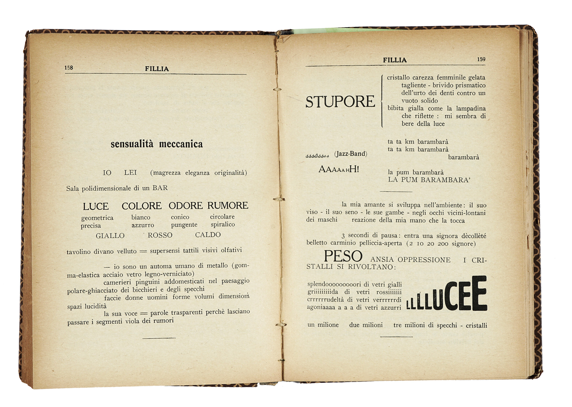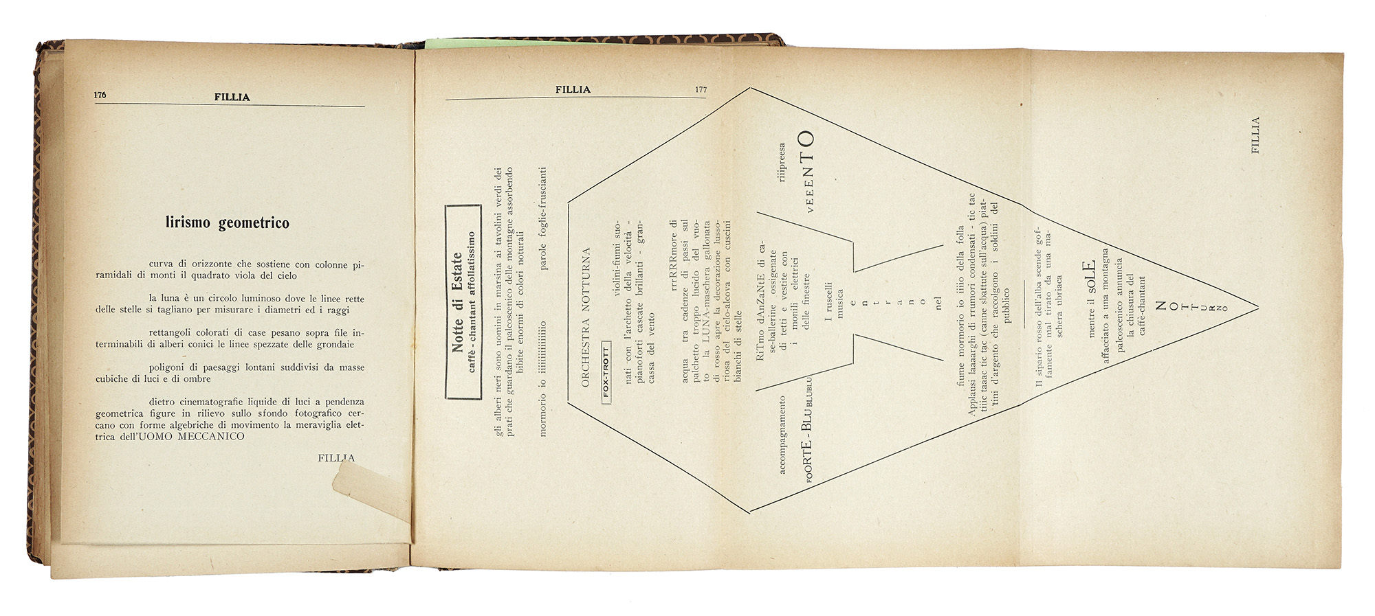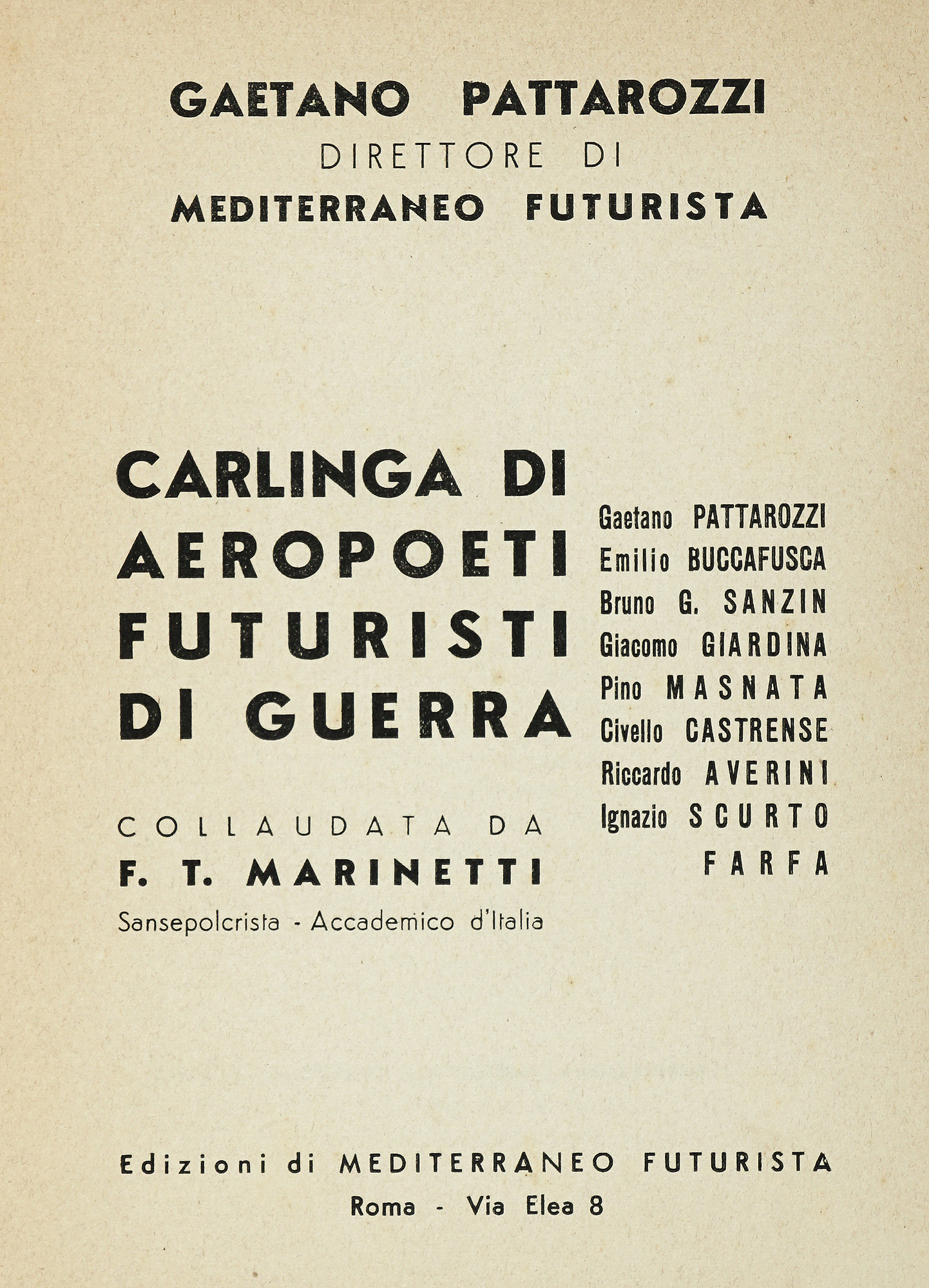 In-8° (mm 192x140). Pagine 361, [1] bianca. Con alcune tavole parolibere ripiegate nel testo. Usuali bruniture marginali della carta e strappetti marginali, restaurabili, ad alcune tavole. Legatura successiva in pieno cartonato, con titoli si tassello al dorso. Quest'ultimo staccato e in gran parte mancante. Copia probabilmente appartenuta a Tito Zaniboni, socialista noto per aver organizzato un attentato contro Benito Mussolini il 4 novembre 1925, come si evince dalla nota di possesso manoscritta al verso della prima carta bianca (Zaniboni. Napoli, ottobre 1925). SI AGGIUNGE: Pattarozzi Gaetano, Carlinga di aeropoeti futuristi di guerra collaudata da F.T. Marinetti. Roma: Edizioni di Mediterraneo Futurista, s.d. [i.e. 1941]. In-8° (mm 215x155). Brossura editoriale con titoli in rosso e nero al piatto. Minime macchie, ma nel complesso ottima conservazione, anche interna. (2)I OPERA: Prima edizione di questa importante antologia di poesia futurista, che include componimenti in versi, parolibere e tavole parolibere grafiche, molte di esse in edizione originale. Futurismo (catalogo di vendita n. 43). Gussago (BS): L'Arengario Studio Bibliografico, 2001, 76. II OPERA: Non comune e importante antologia di aeropoesia, in prima edizione, con i testi di Sanzin, Masnata, Averini, Giardina e altri.