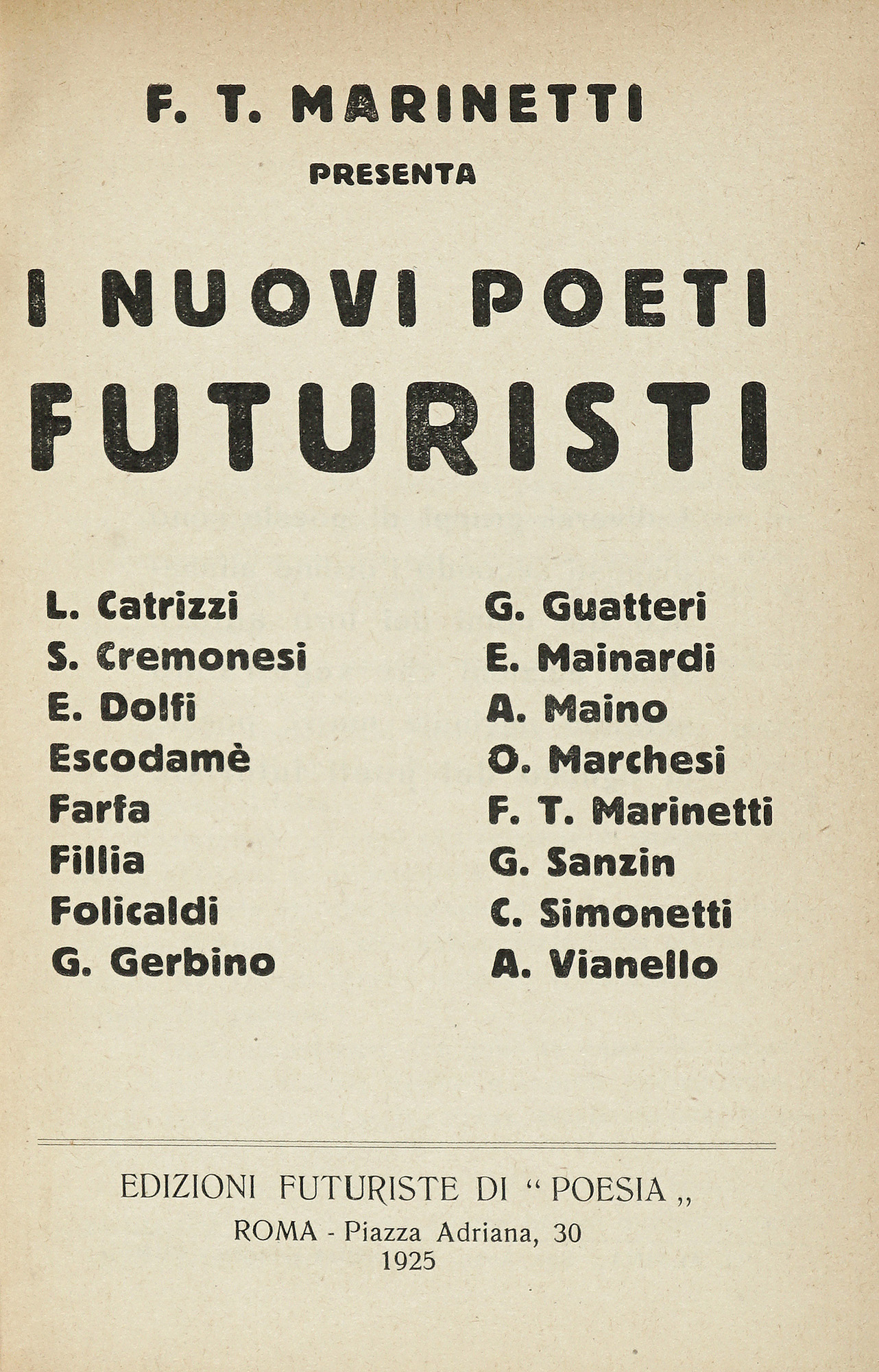 Marinetti Filippo Tommaso, I nuovi poeti futuristi. Roma: Edizioni Futuriste di Poesia, 1925.