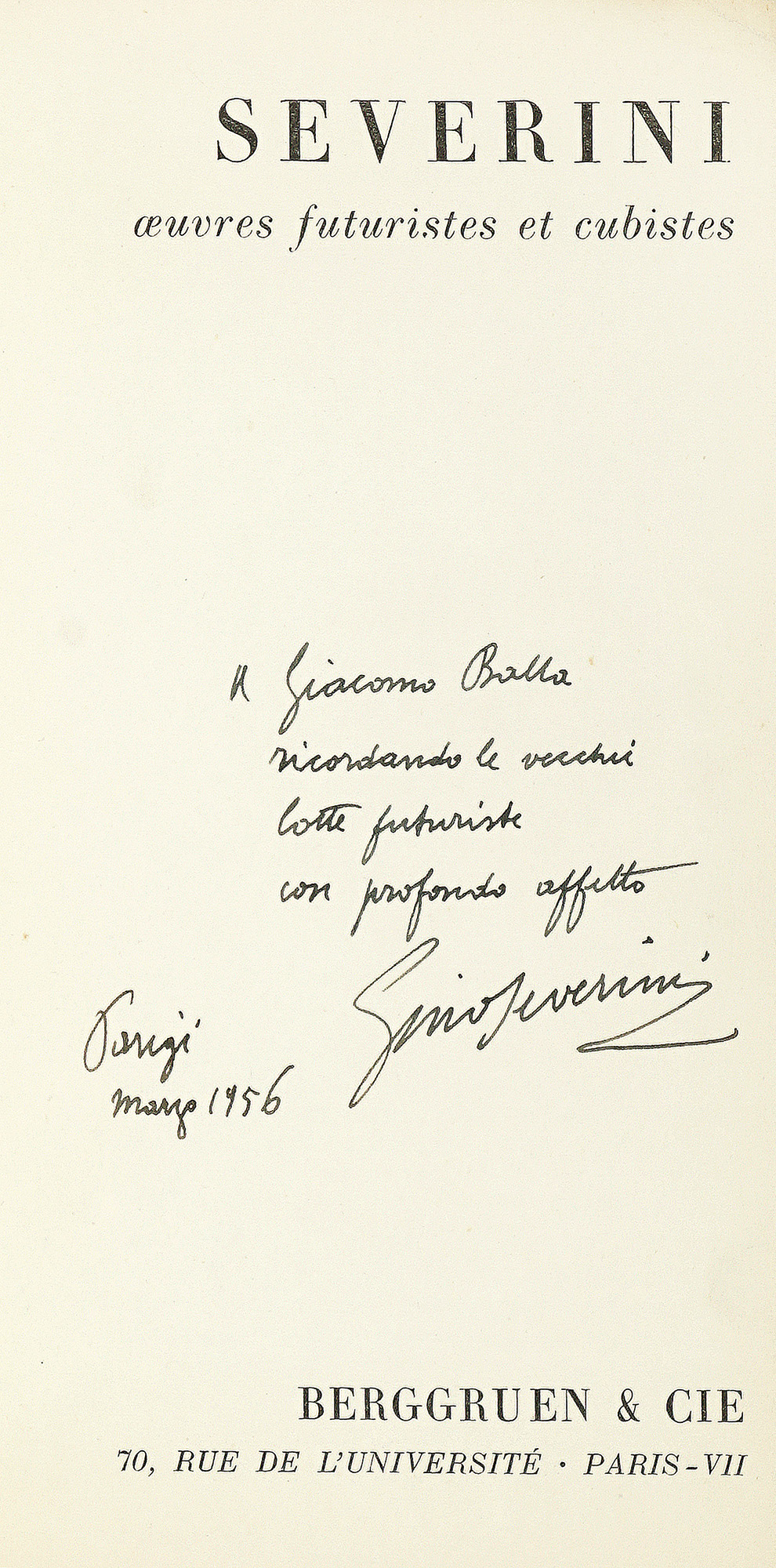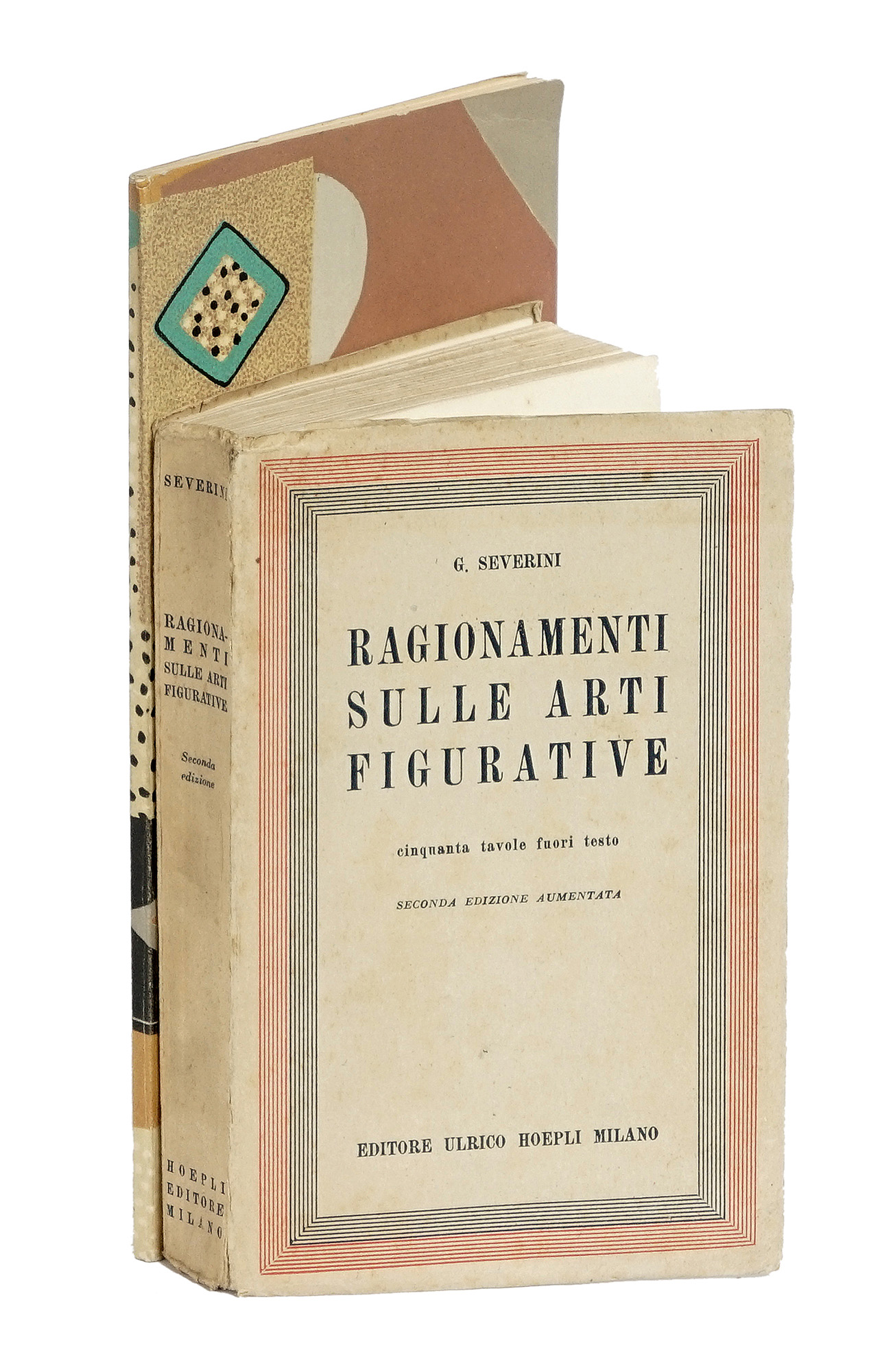 In-8° (mm 220x115). Carte [12]. Esemplare in ottimo stato di conservazione, con 15 tavole in fototipia nel testo, alcune delle quali ritoccate a pochoir. Brossura editoriale interamente litografata. Al frontespizio, una bella dedica autografa di Gino Severini «A Giacomo Balla / ricordando le vecchie / lotte futuriste / con profondo affetto», datata marzo 1956. SI AGGIUNGE: Id., Ragionamenti sulle arti figurative. Cinquanta tavole fuori testo. Milano: Ulrico Hoepli, 1942. In-16° (mm 170x105). (2)-