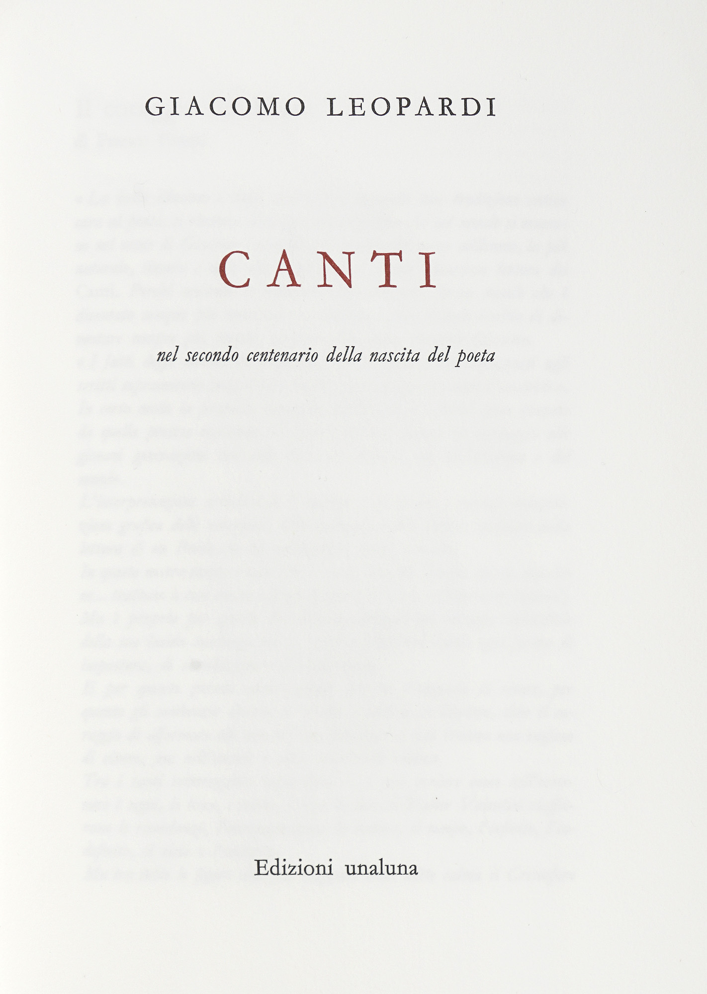 Leopardi Giacomo, Canti. Nel secondo centenario della nascita del poeta. Ancona: Unaluna, 1998.