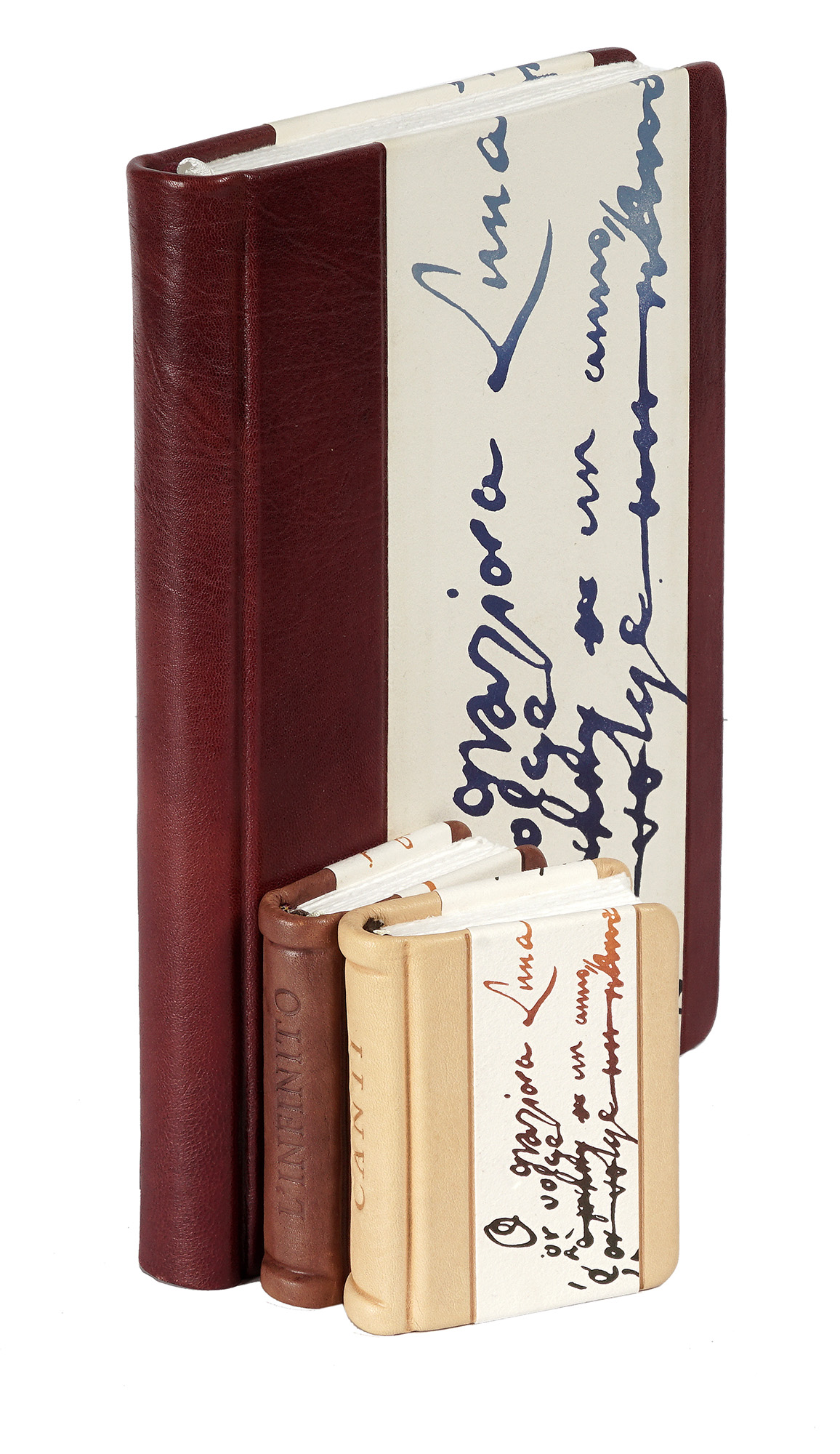 In-8° (mm 260x175). Con 1 splendida acquaforte di Walter Valentini a piena pagina, firmata a matita dall'Artista. Ottima copia in barbe. Legatura editoriale in mezza pelle, con piatti in carta decorata. Tiratura in 199 esemplari numerati e firmati a matita al colophon. SI AGGIUNGE: Id., (I Canti). Secondo centenario della nascita di Giacomo Leopardi. Recanati: [Unaluna], 1998. In-16° (mm 90x65). Grazioso esemplare in miniatura in barbe, arricchito da una bella acquaforte originale di Walter Valentini a piena pagina, numerata (154/500) e firmata dall'Artista. Legatura editoriale in mezza pelle, con titolo in oro al dorso. SI AGGIUNGE: Id., (L'Infinito). Secondo centenario della nascita di Giacomo Leopardi. Recanati: [Unaluna], 1998. In-16° (mm 90x65). Grazioso esemplare in miniatura in barbe, arricchito da una bella acquaforte originale di Walter Valentini a piena pagina, numerata (492/500) e firmata dall'Artista. Legatura editoriale in mezza pelle, con titolo in oro al dorso. (3)I OPERA: Volume realizzato in collaborazione con il Centro Nazionale di Studi Leopardiani, arricchito dalle riproduzioni di cinque manoscritti di Giacomo Leopardi.