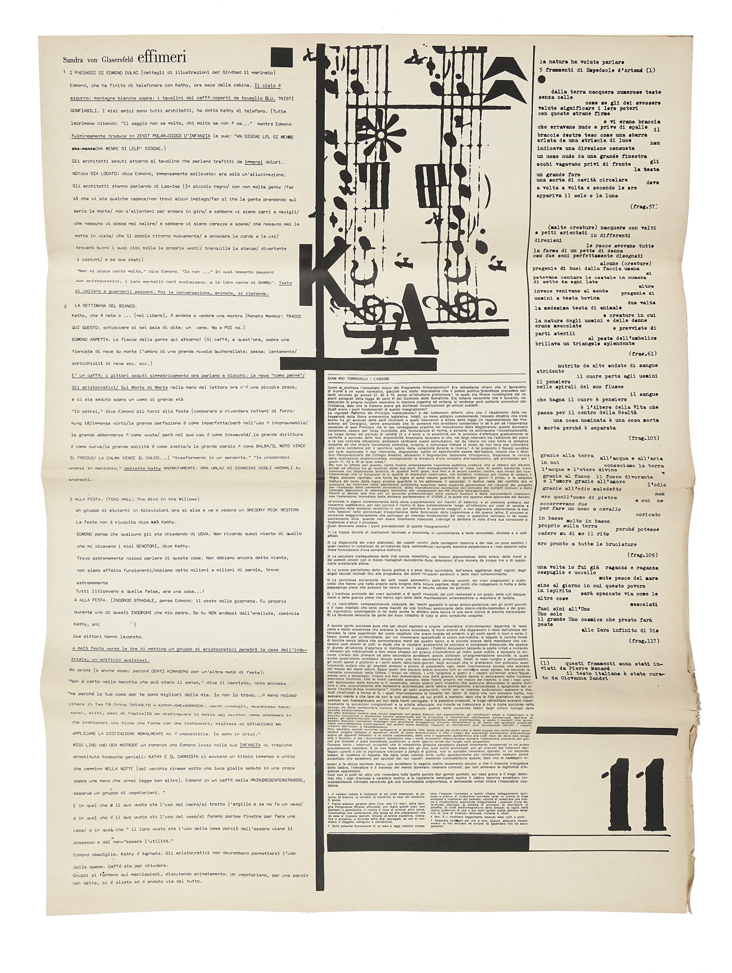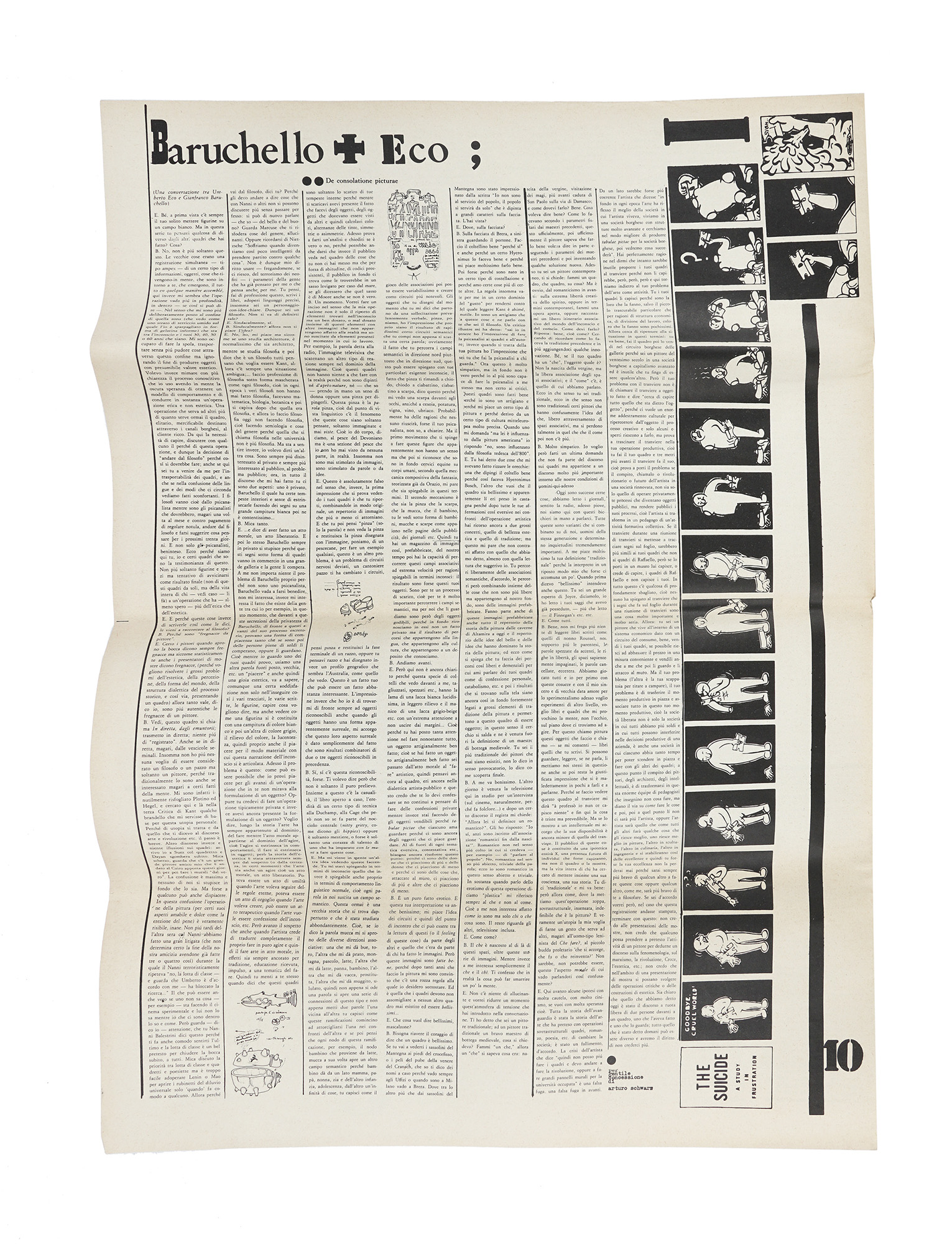 In-folio (mm 710x500). Pagine 40. Esemplare a bifoli sciolti, con numerosi testi e illustrazioni in nero di Gustav Bally, Renato Barilli, Giuseppe Bartolucci, Gianni Bertini, Sylvano Bussotti, Luciano Caruso, Paolo Castaldi, Gaetano Testa e molti altri. Segni di piegature centrali e strappi marginali senza perdite ad alcune pagine, ma nel complesso buona copia. (1)Edizione originale del numero unico di questa rivista che si avvale della cura redazionale e dell'impostazione grafica di Magdalo Mussio. Lo spazio della pagina-manifesto accoglie immagini fotografiche e testi in libertà di numerosi Artisti.