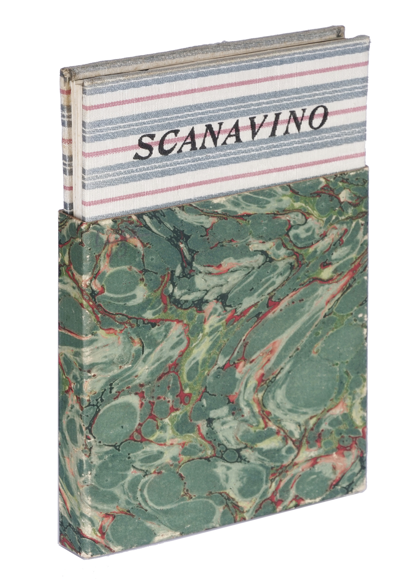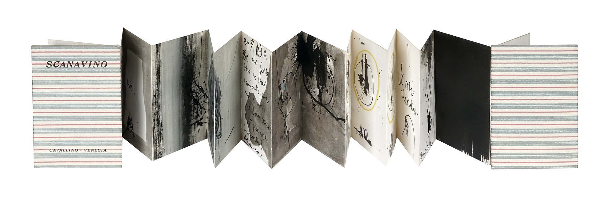 In-8° (chiuso: mm 147x100; aperto: mm 147x2200 ca.). 1 carta di frontespizio, 1 di colophon e 14 carte interamente litografate. Legatura editoriale in seta, con titolo al piatto, sguardie decorate e fascetta editoriale in cartoncino marmorizzato. Edizione in 200 esemplari, numerati e firmati a matita da Emilio Scanavino. (1)