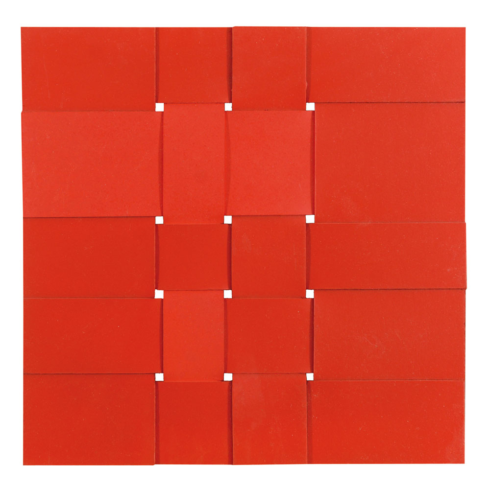 smalto acrilico rosso su cartone intrecciato cm. 50x50,5; firma, titolo, anno, tecnica e timbro della Galleria Visualità (MI) al retro, dichiarazione d'autenticità e archivio dell'artista su foto, entro teca in plexiglass.
