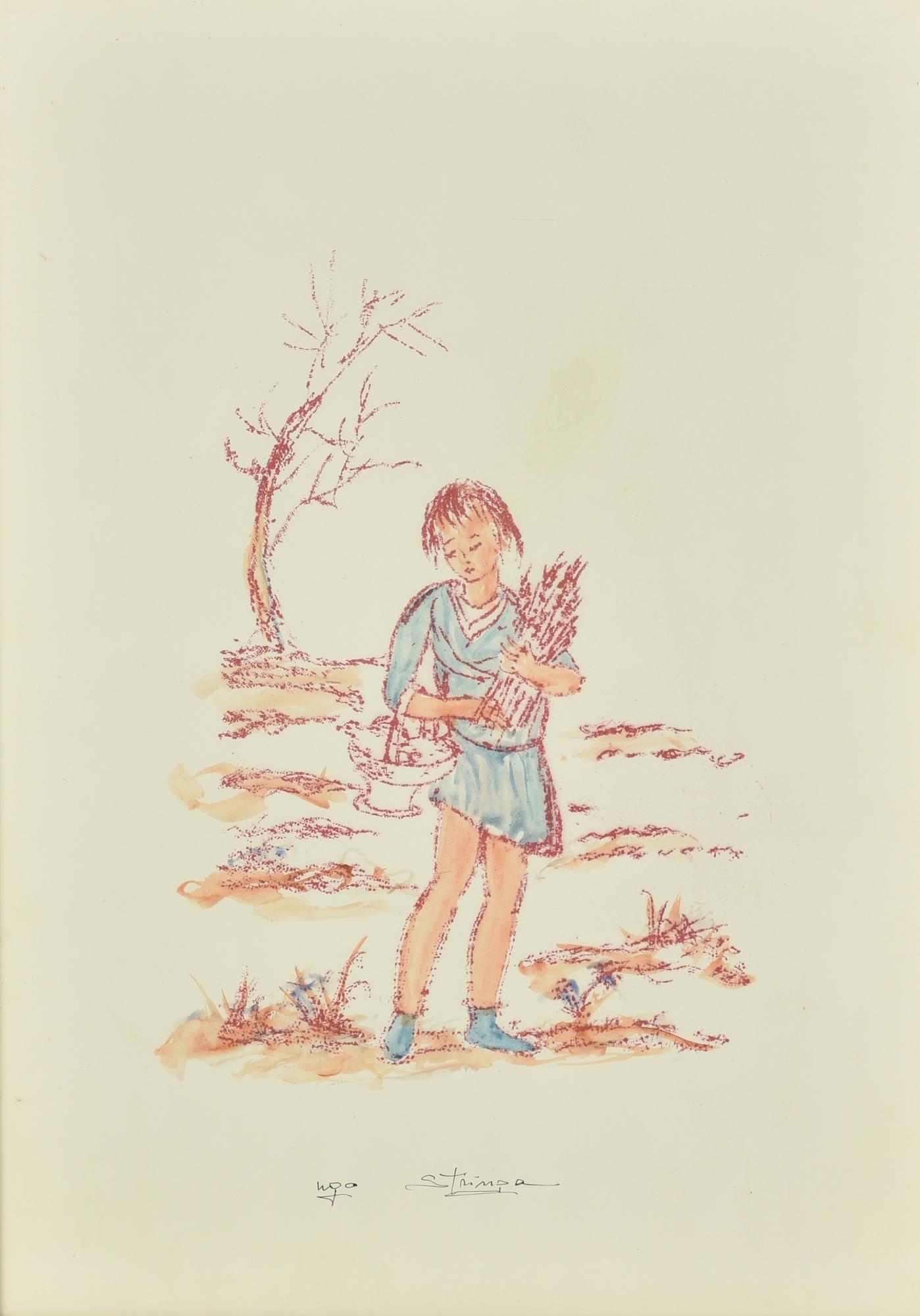 Ugo Stringa RACCOGLITRICE DI FIORI tecnica mista su carta, cm 50x35 firma