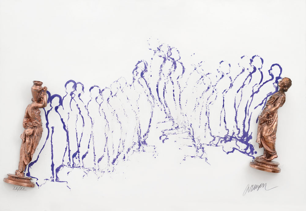 sculture e tracce su carta entro teca in plexiglass cm. 75x108,5x10, esemplare XX/XX, firma in basso a destra, opera registrata presso l'Archives Denyse Durand-Ruel al numero 3643 come da dichiarazione su foto.