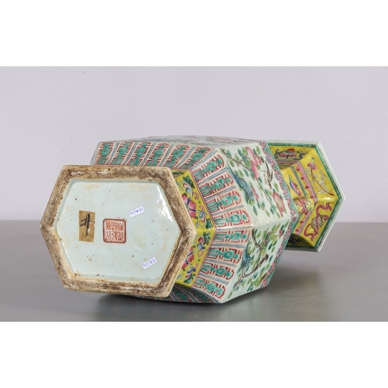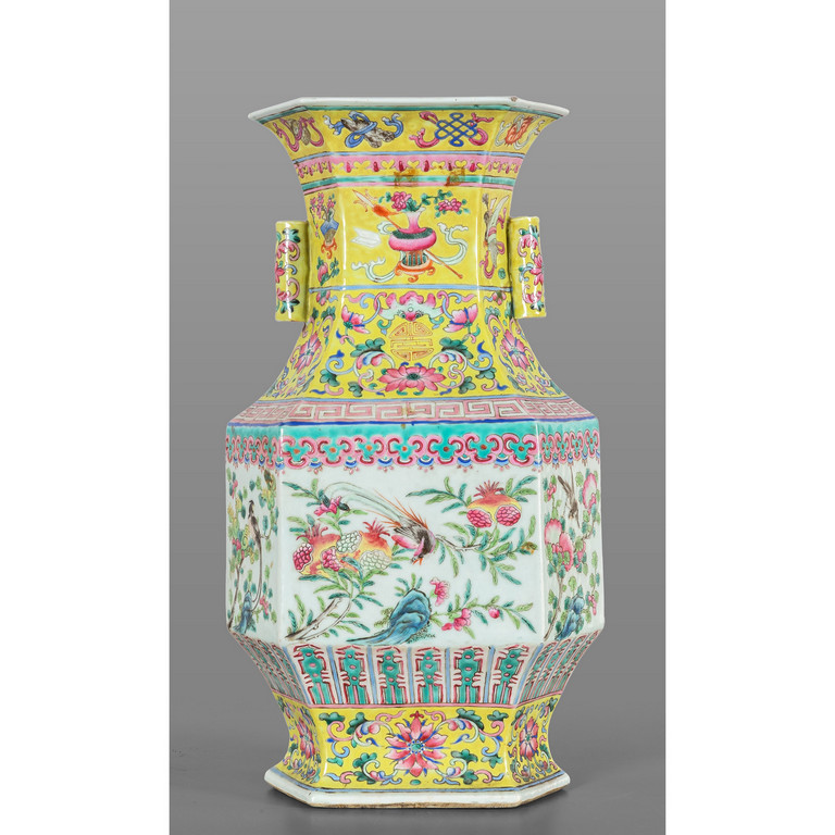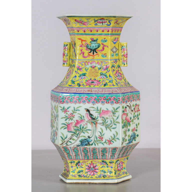 Vaso in porcellana di Cina decorato nei toni del verde rosa e giallo con uccellini e melograni