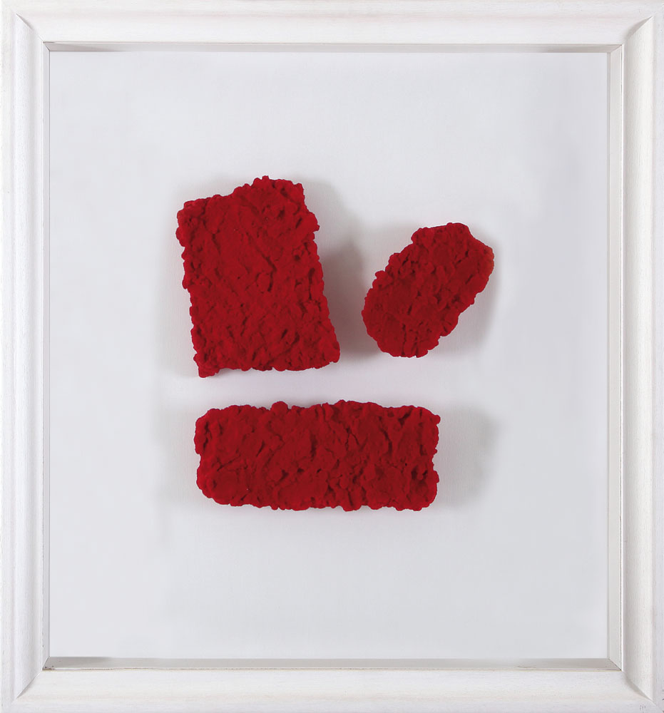 opera in 3 elementi rossi di cm. 26x12, 21x15 e 16x10, entro unica cornice cm. 67x62, firma e titolo al retro sull'elemento numero 3, dichiarazione d'autenticità dell'artista su foto.
