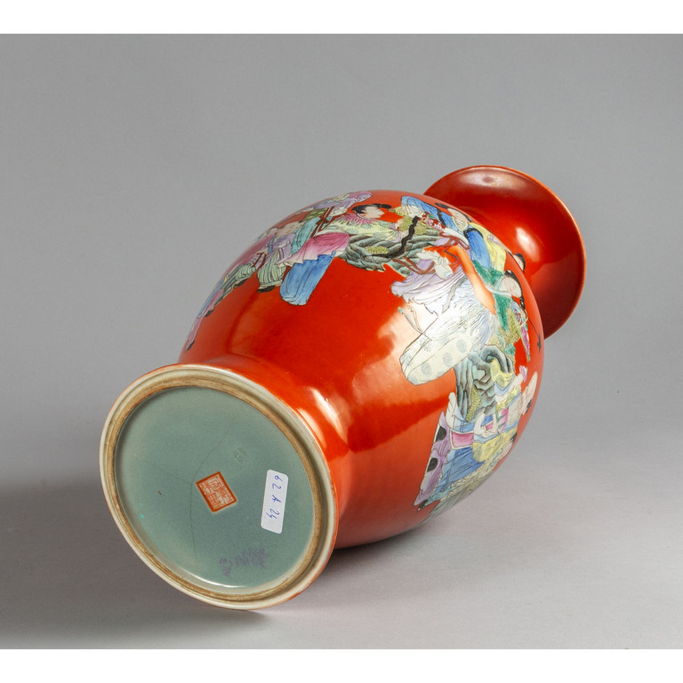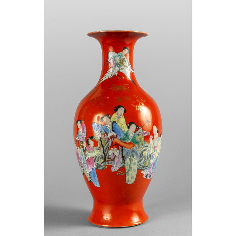 Vaso in porcellana a fondo rosso decorato con saggio e figure femminili marcato alla base Cina inizi sec.XX