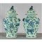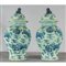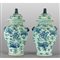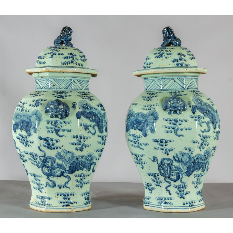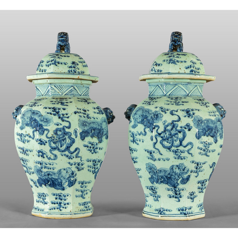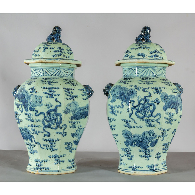 Coppia di potiches con coperchio di forma ottagonale in porcellana decorata in bianco e blu Cina fine sec.XIX
