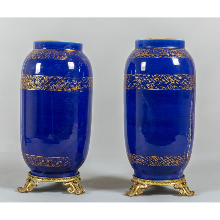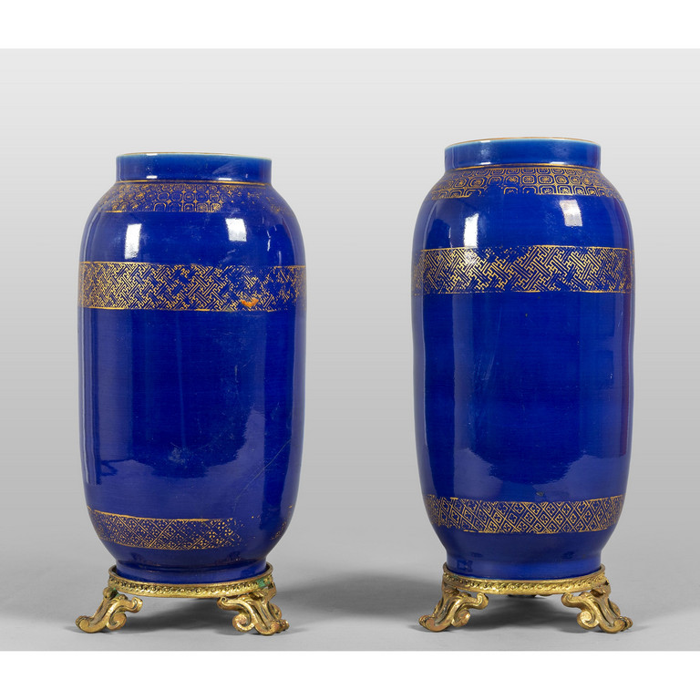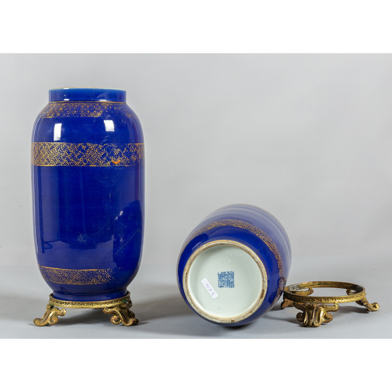 Coppia di vasi in porcellana a fondo blu marcati in oro a freddo marcati alla base poggianti su basi dorate Napoleone III Cina sec.XVIII