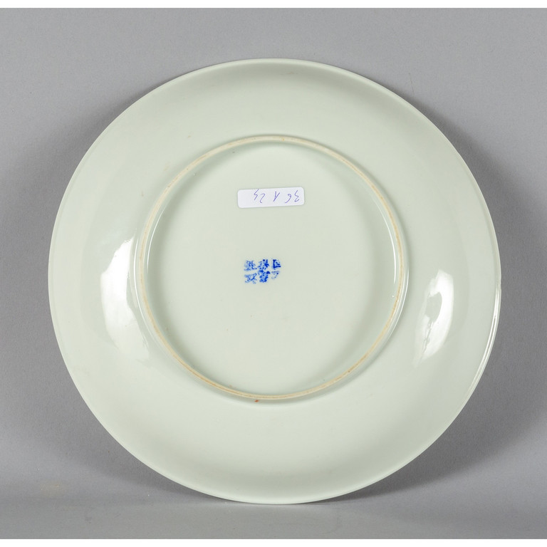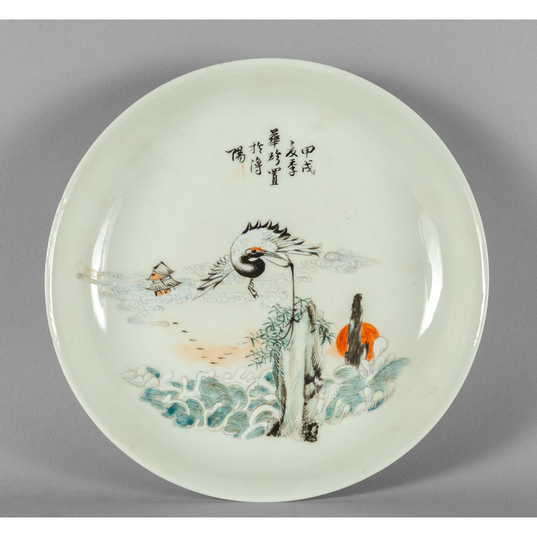 Piatto in porcellana decorato con airone e pagoda Giappone sec.XIX