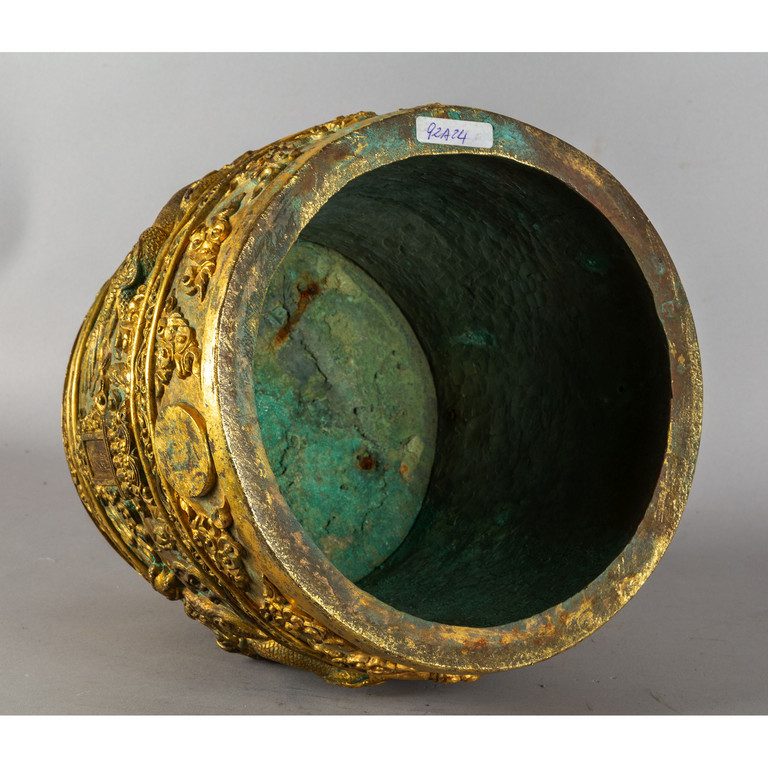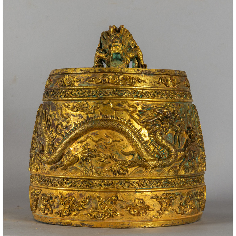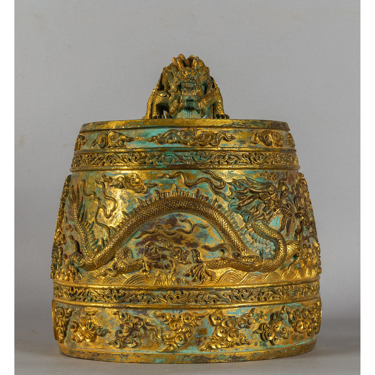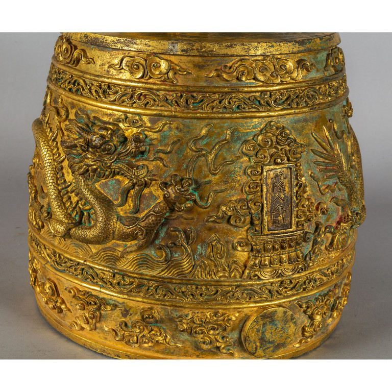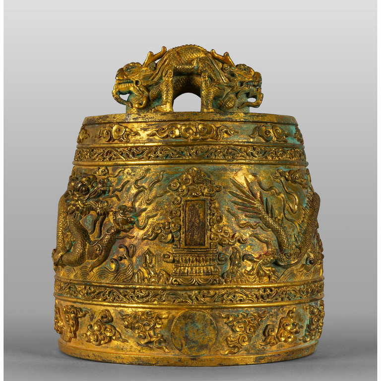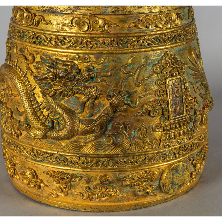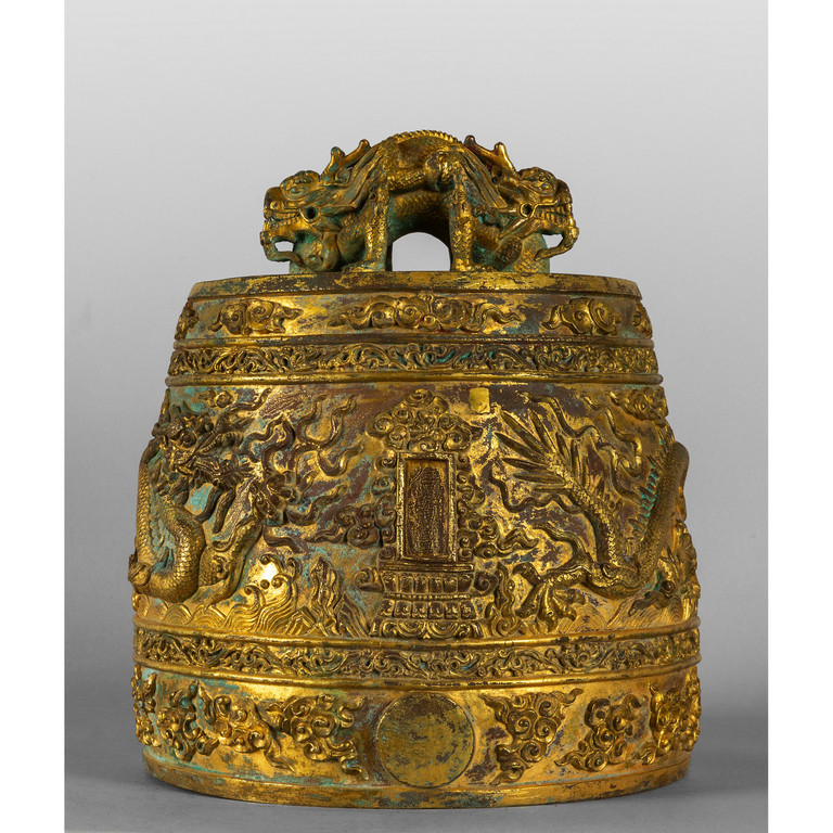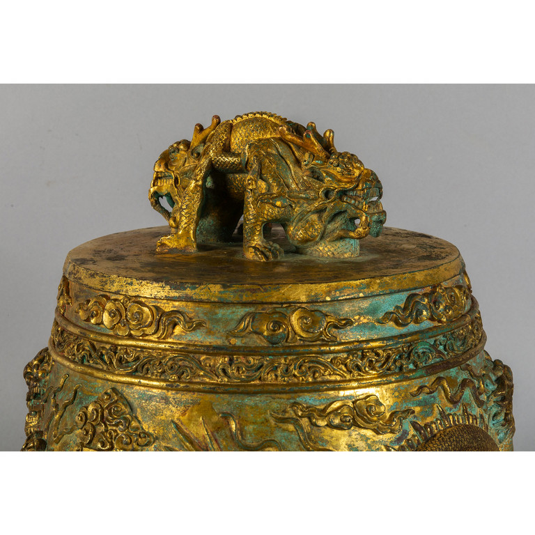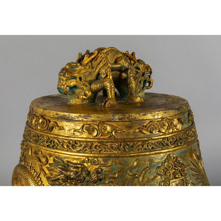 Importante campana in bronzo dorato decorata con dragone e nuvole manico a doppio dragone marcata Qian-Long Cina dinastia Qing