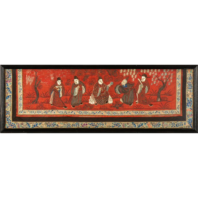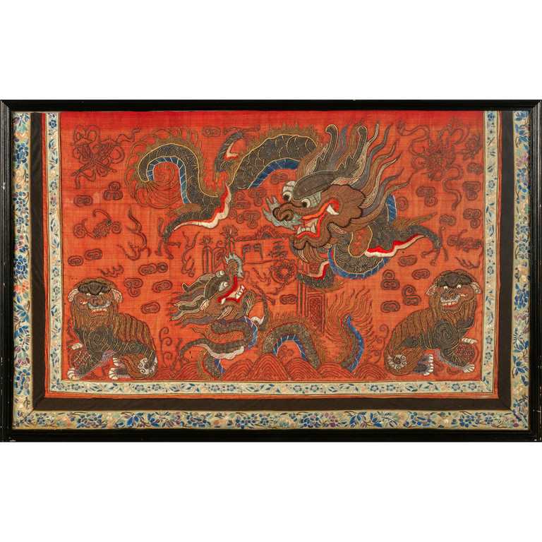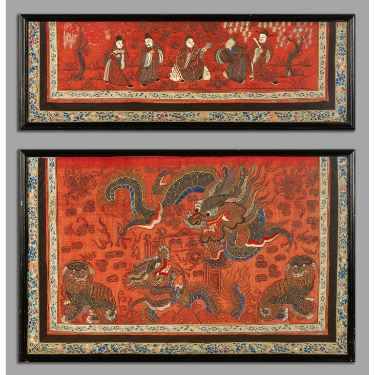 Due ricami in seta raffiguranti personaggi e dragoni Cina sec.XIX