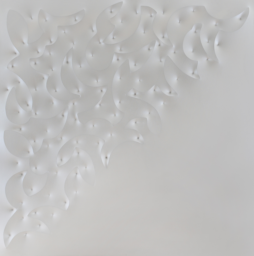 tela estroflessa bianca cm. 120x120, firma e titolo al retro, dichiarazione d'autenticità dell'artista su foto, opera priva di cornice.