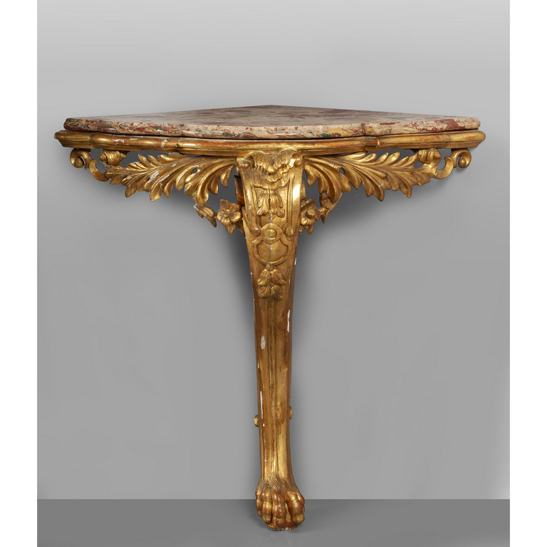 Angonale in stile Luigi XV in legno intagliato e dorato piano in breccia sec.XIX