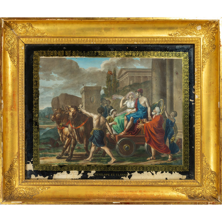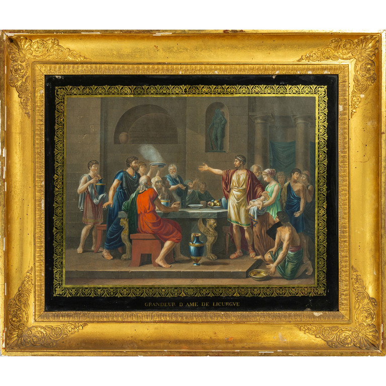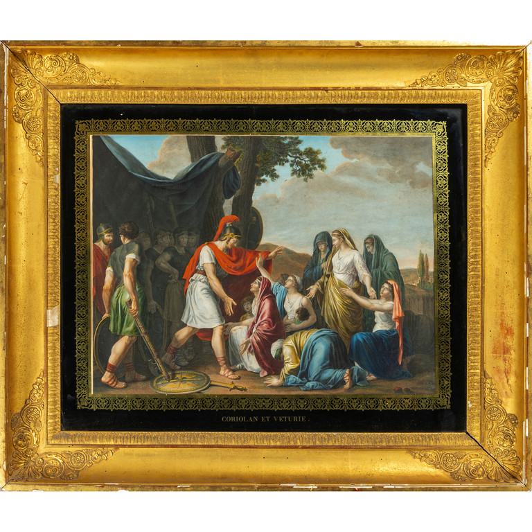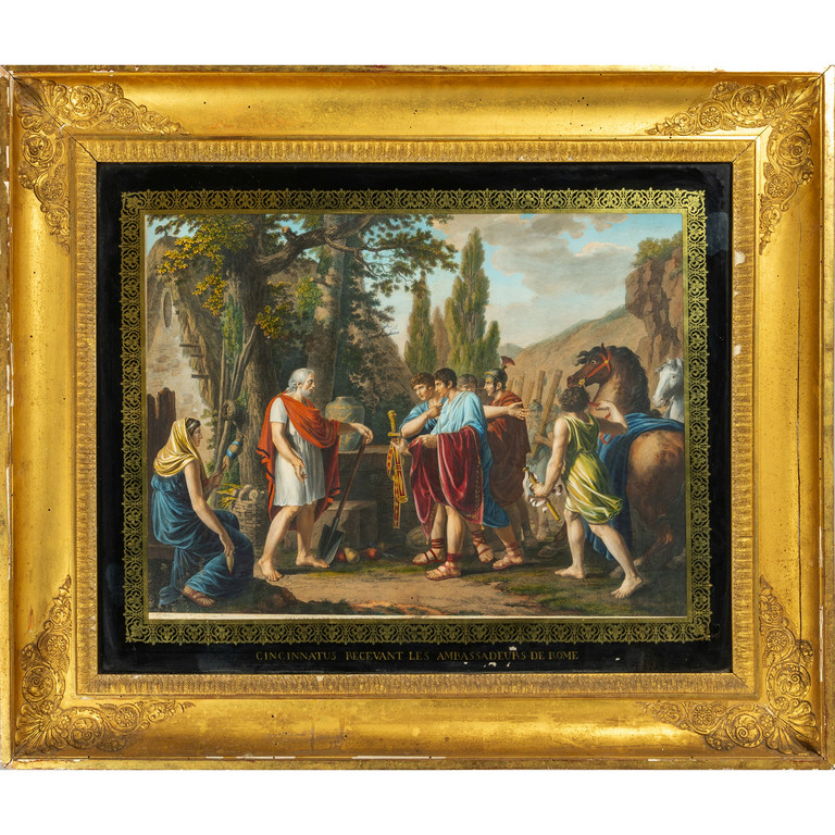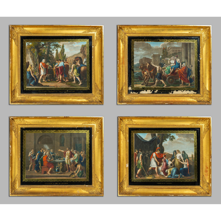 Quattro grandi incisioni colorate raffiguranti episodi dell'antica Roma II metà sec.XIX cornici coeve in legno intagliato e dorato
