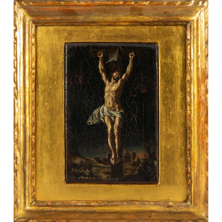 Scuola tedesca sec.XVIII 'Crocefissione' olio f.to in b.a s. e d.to 1777