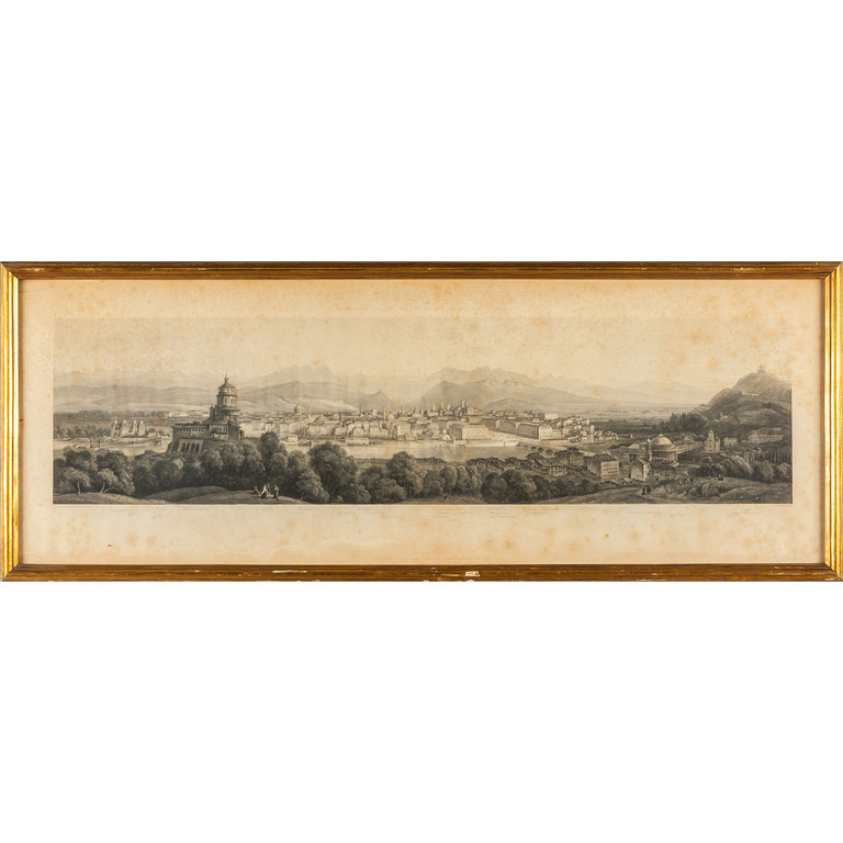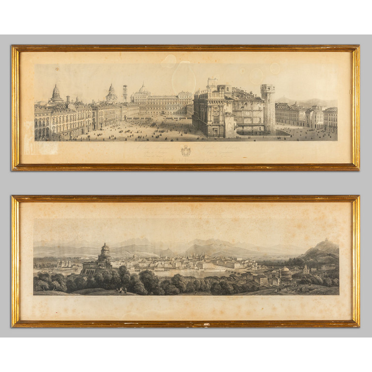 Coppia di incisioni raffiguranti la Città di Torino da disegni di Bossoli incise da Salathe e da Citterio sec.XIX