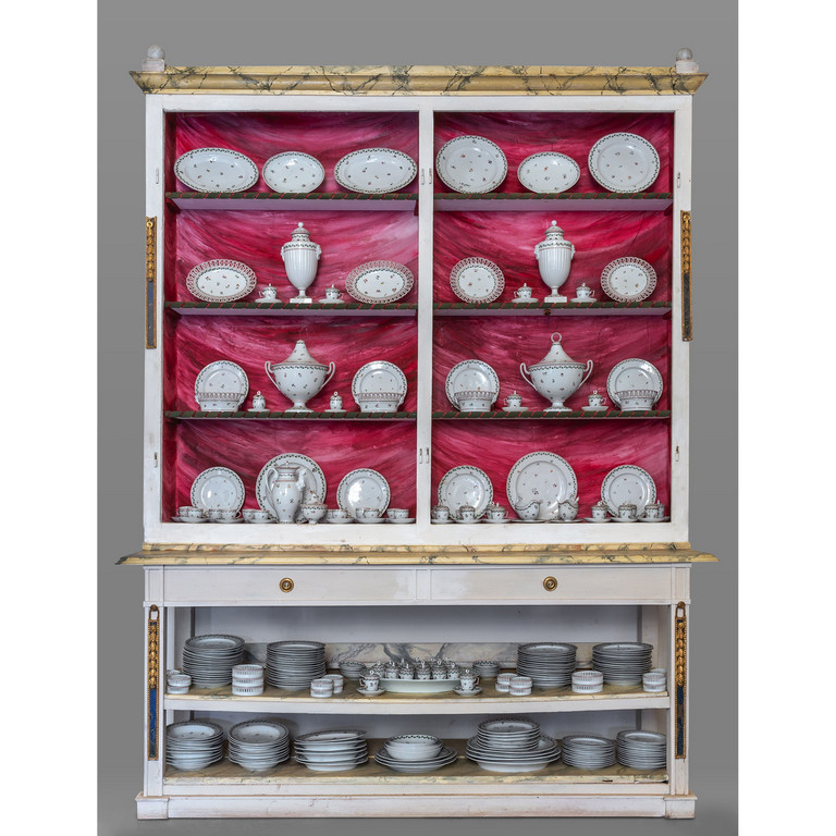 Importante servizio in porcellana decorata a foglioline e fiorellini policromi su fondo bianco fine sec.XVIII (Ginori?) composto da: 72 piatti piani 19 fondi 24 da frutta 34 cremierine con 38 piattini 12 tazze da caffè con 12 piattini 2 zuppiere 2 tulipaniere 1 theiera 1 zuccheriera 2 salsiere (di cui 1 con cucchiaio) 16 sottobicchieri 5 sottobottiglie 2 cestini ovali e 2 rotondi 2 piatti ovali da portata traforati e 2 rotondi 18 piatti ovali da portata di diverse misure 2 coppe ovali 5 piatti da portata rotondi 2 coppie di coppe rotonde 2 mostardiere e 9 cucchiaini traforati (difetti)