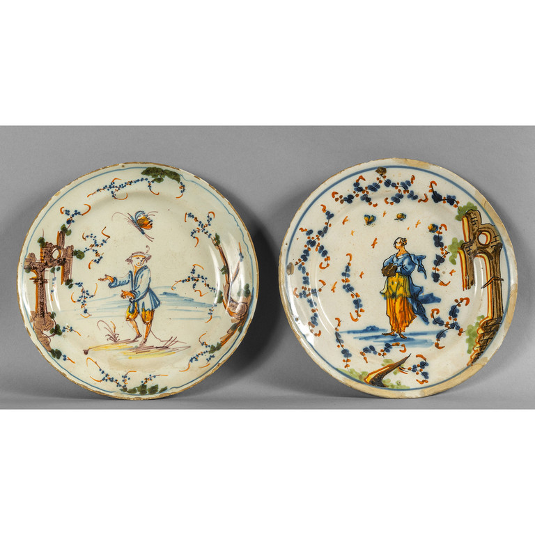 Coppia di piatti in ceramica decorati in policromia con figure e rovine uno marcato GB e uno marcato Stella Savona sec.XVIII