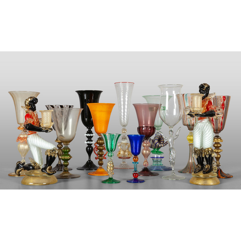 Tredici bicchieri in vetro di Murano e due candelieri con moretti