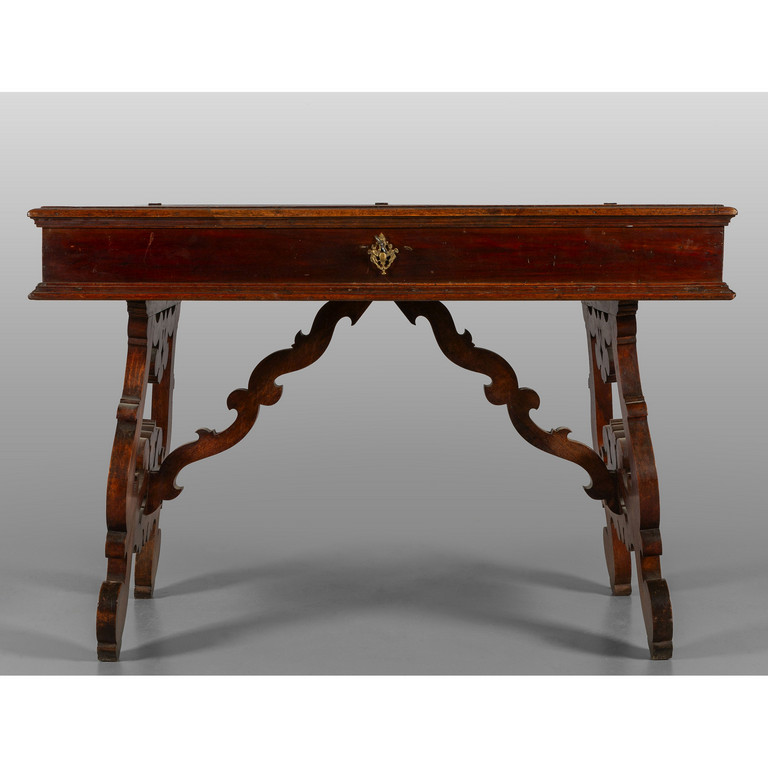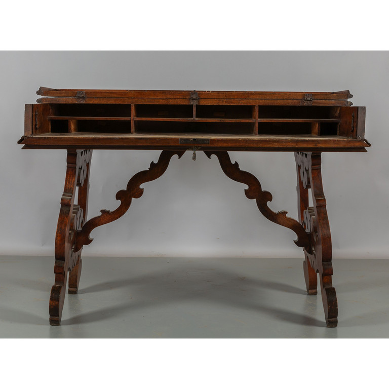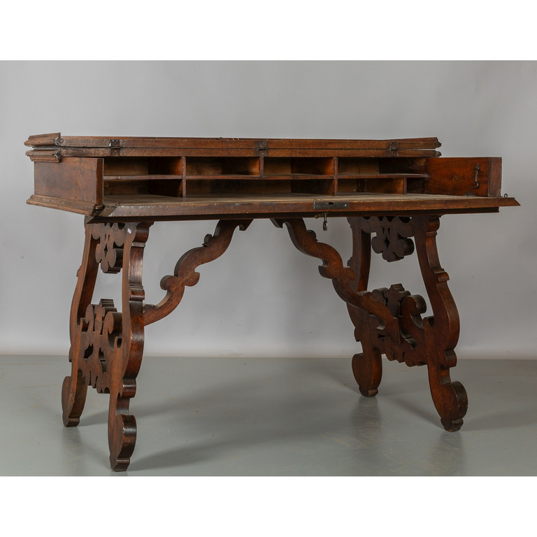 Scrivania Sanfilippo in noce gambe raccordate da traversa sec.XVII