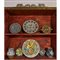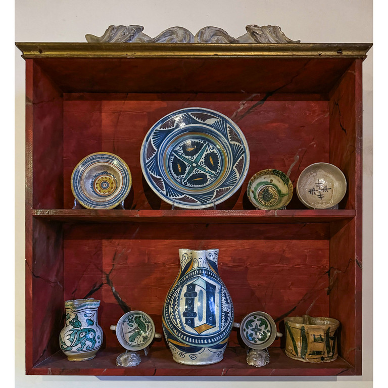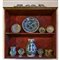 Coppia di teche in legno laccato a finto marmo contenenti oggetti di epoche e manifatture diverse (gravi difetti)