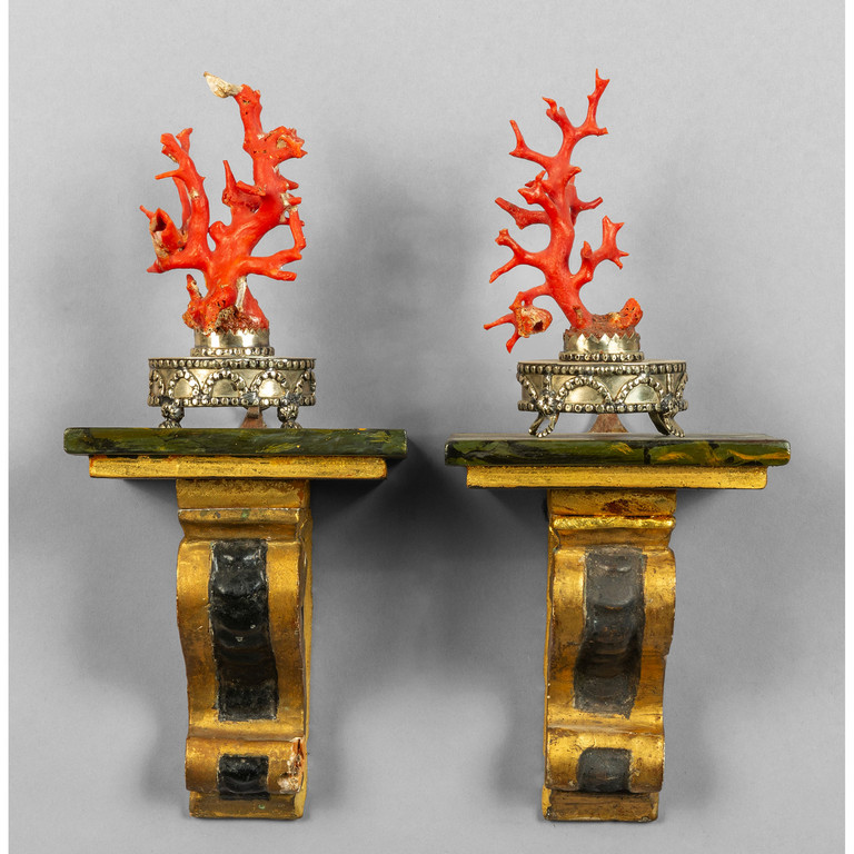 Coppia di rametti in corallo montati su basette in argento (h.tot.cm.16) mensole in legno intagliato sec.XX