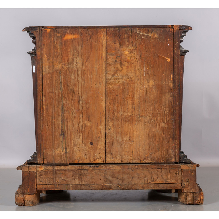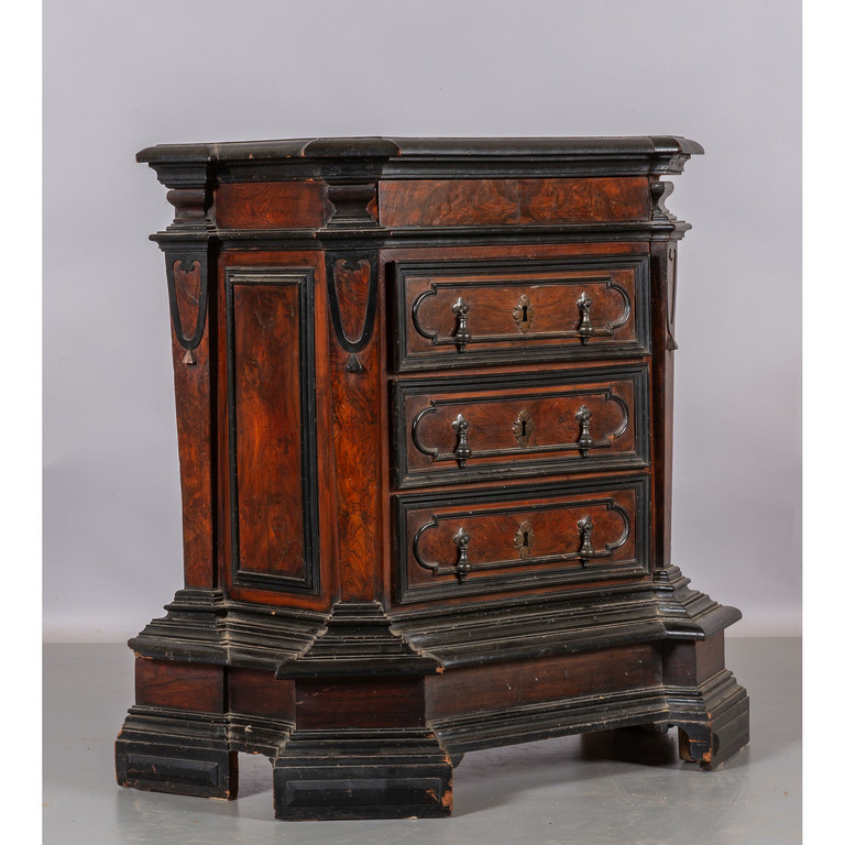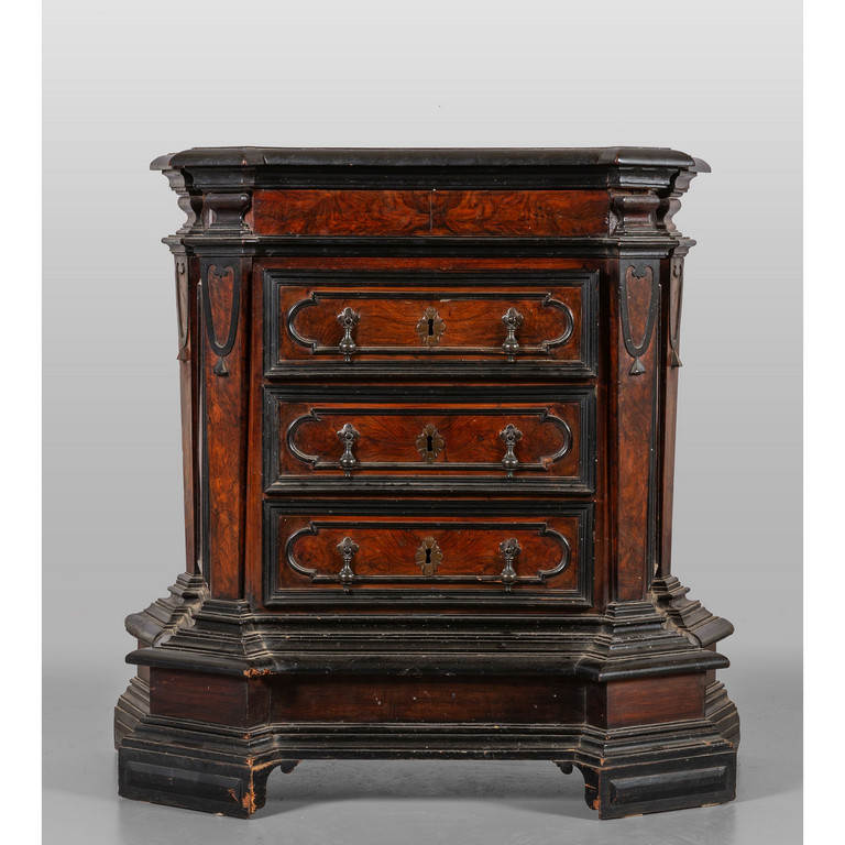 Piccolo comò Luigi XIV a quattro cassetti lastronato in noce con cornicette in legno ebanizzato Roma inizi sec.XVIII