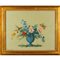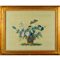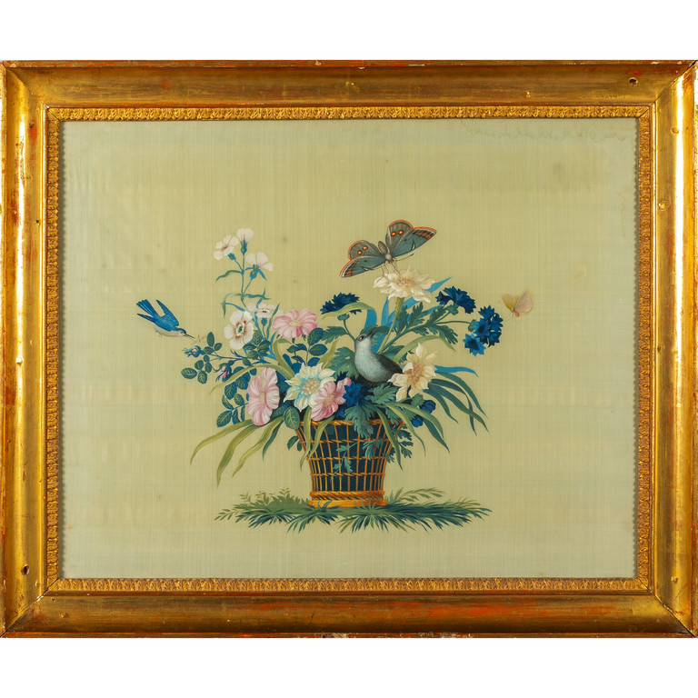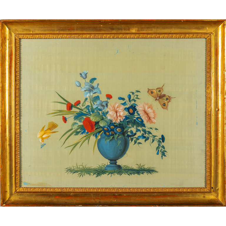 'Vasi di fiori con uccellini e farfalle' coppia di tempere su seta I metà sec.XIX cornici coeve in legno intagliato e dorato