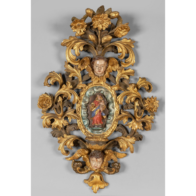 Grande acquasantiera in legno finemente intagliato dorato e policromato Italia Meridionale sec.XVIII