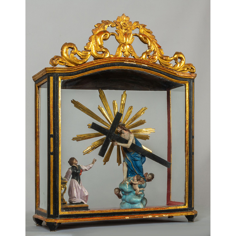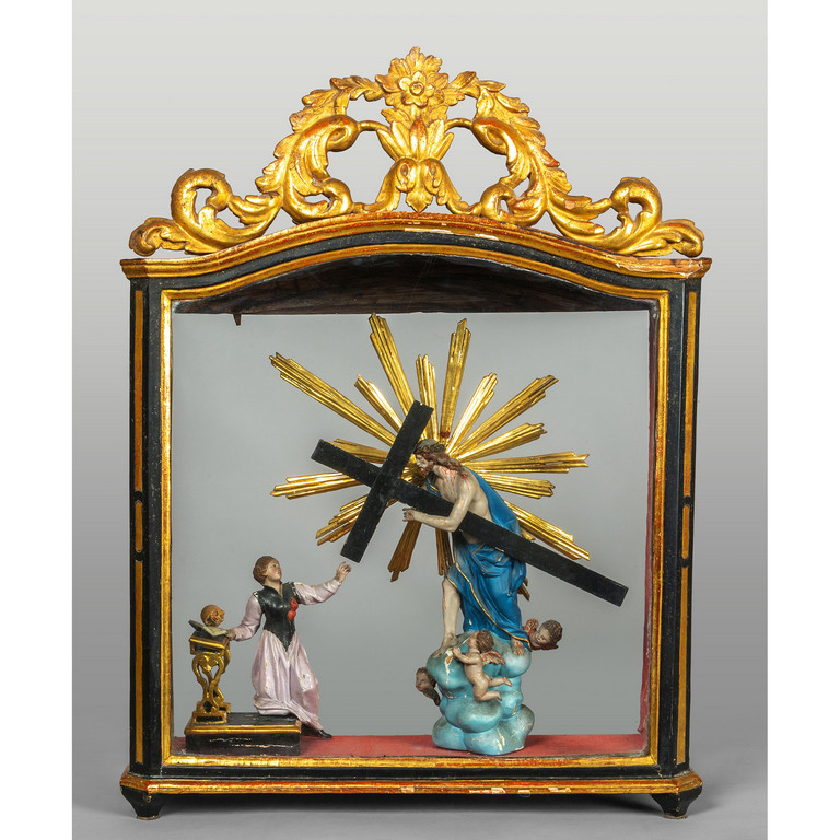 Santa Caterina con Gesù con la Croce gruppo in legno intagliato e policromato teca in legno laccato con cimasa dorata Genova sec.XVIII