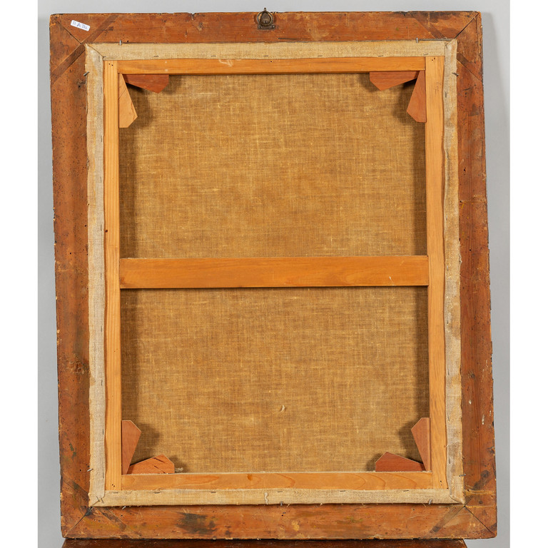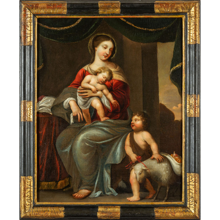Scuola italiana sec.XVIII 'Madonna con Bambino e San Giovannino' olio cornice antica in legno ebanizzato ed oro