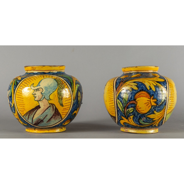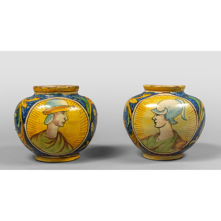 Due vasi in maiolica decorati in policromia con profili di guerrieri Palermo sec.XVII