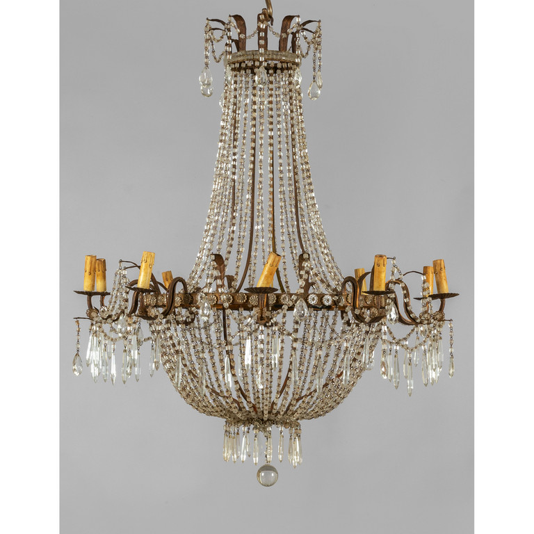 Lampadario a mongolfiera in lamierino dorato con ricca decorazione in perle di vetro fine sec.XIX