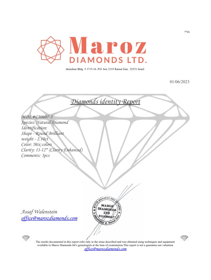 3 DIAMANTI PUREZZA ESALTATA S 2,1 CARATI MIX COLORS - PUREZZA I1-2* - TAGLIO BRILLANTE - CERTIFICATO GEMMOLOGICO MAROZ DIAMONDS LTD MEMBRO ISRAEL DIAMOND EXCHANGE - C30607-3
