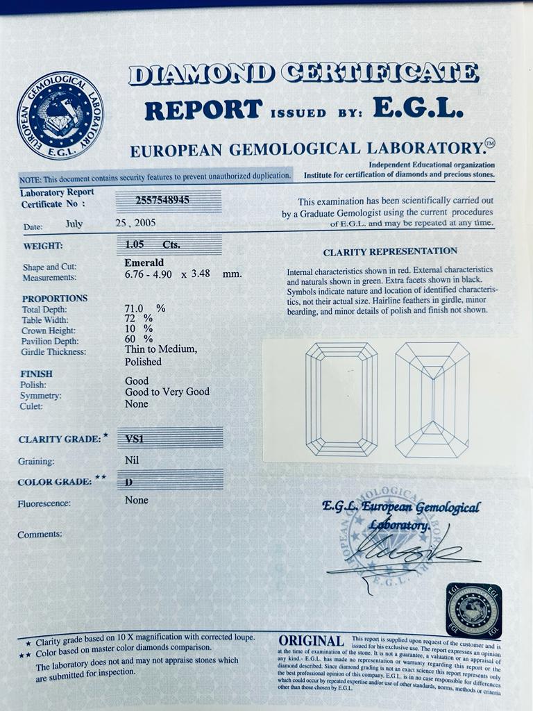 DIAMANTE NATURAL POLISHED 1,05 CARATI COLORE D - PUREZZA VS1 - TAGLIO SMERALDO - CERTIFICATO EGL - DH30107